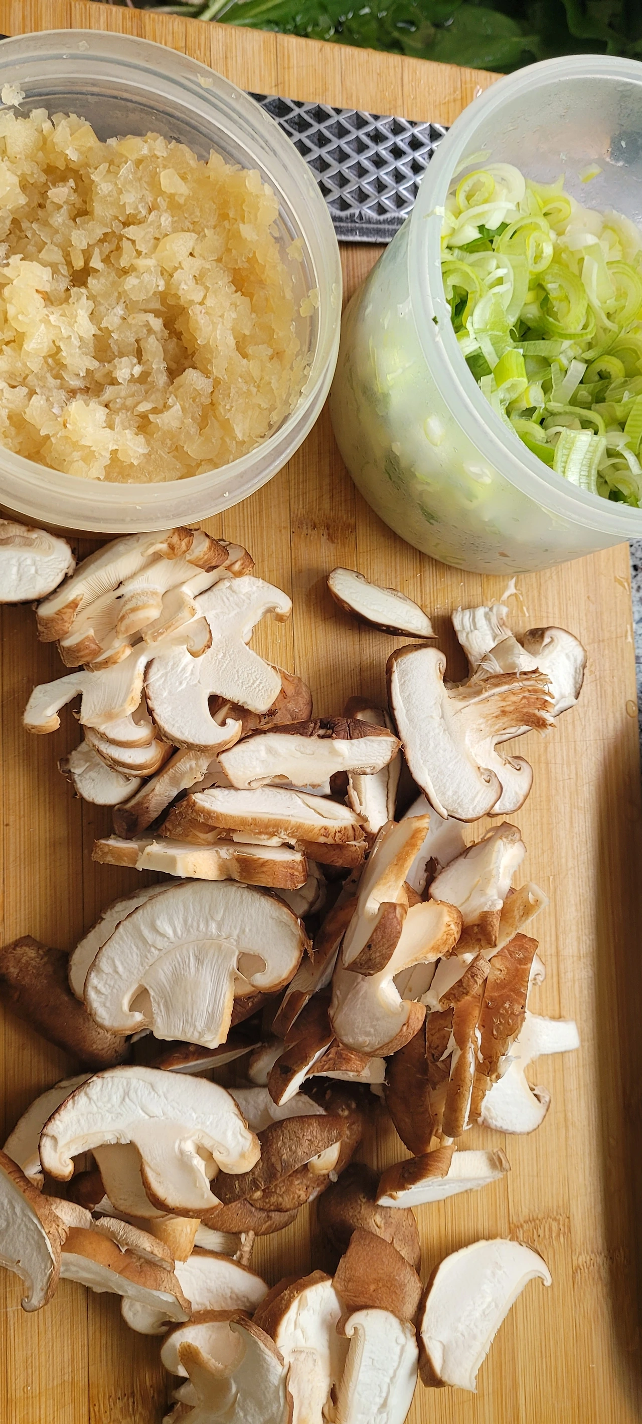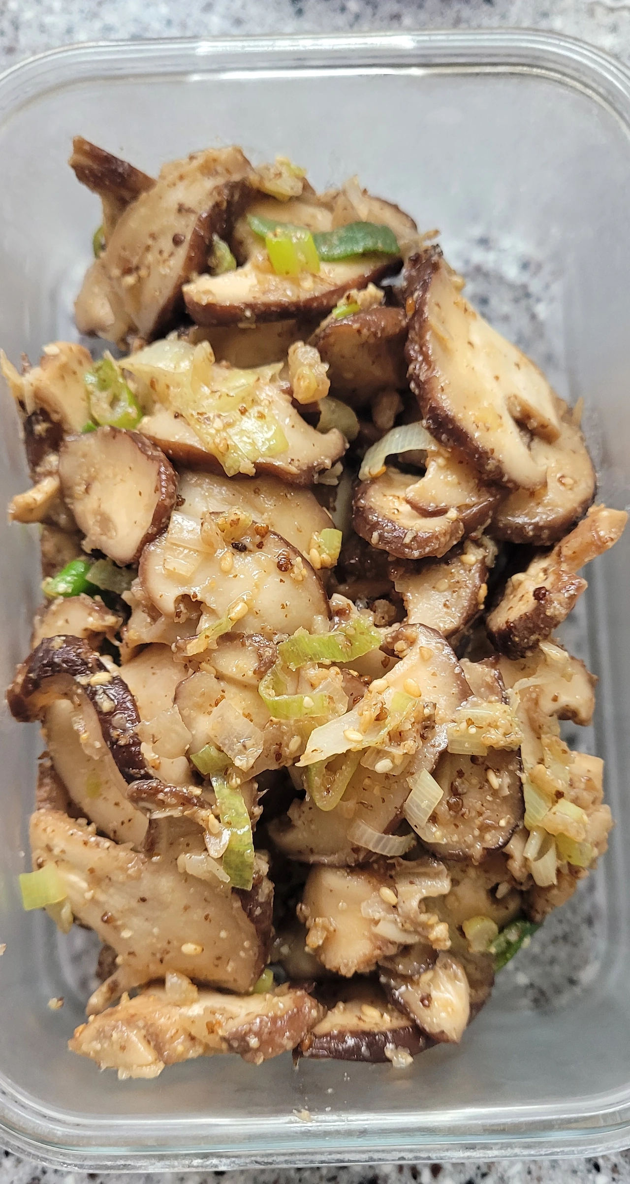 재료: 표고버섯 8개, 간 마늘, 대파, 굴소스, 소금, 들깻가루, 통깨, 참기름
