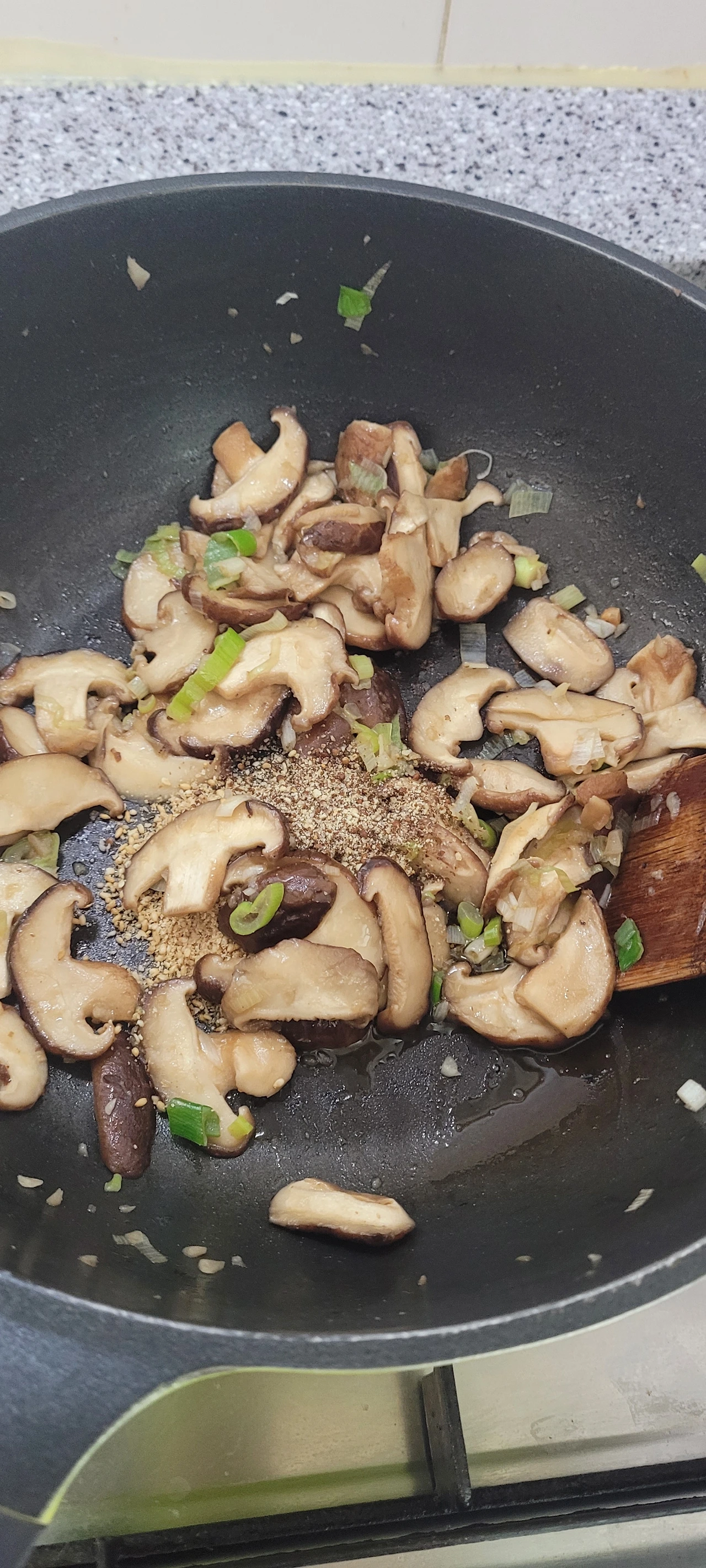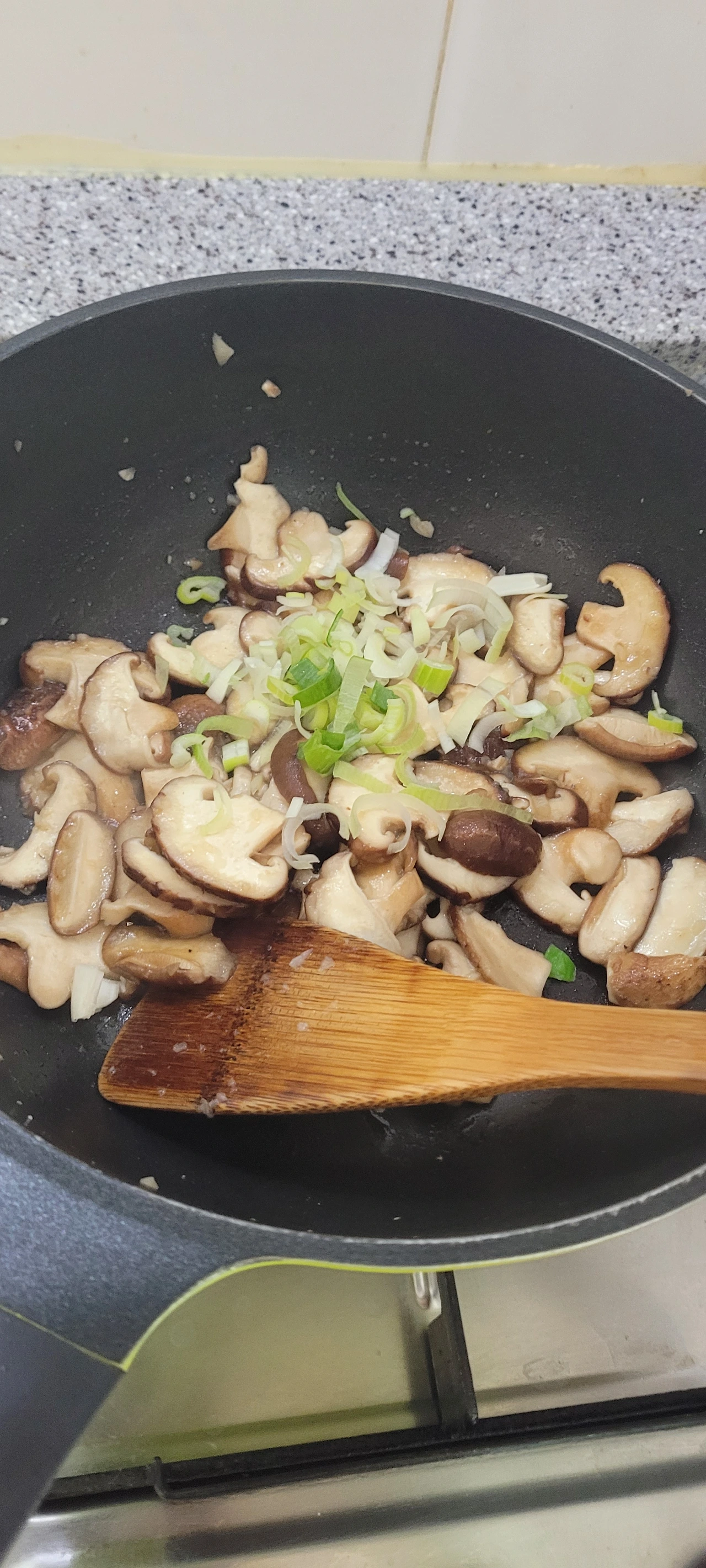 3. 표고버섯이 숨이 죽으면 소금과 굴소스로 간을 하고 대파 넣고 볶아 줍니다.