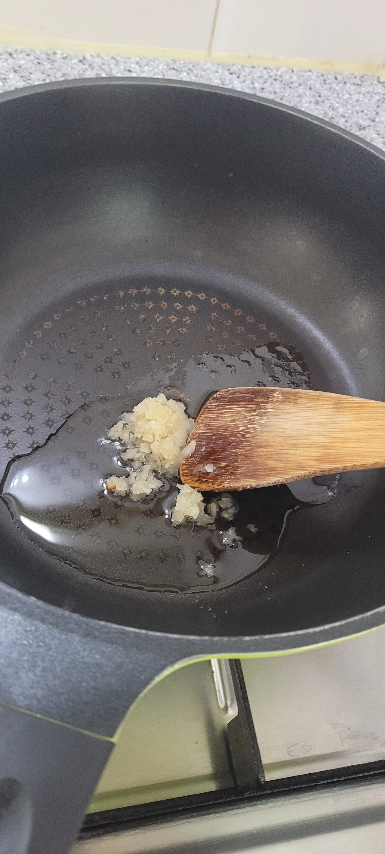 1. 팬에 식용유 한 스푼 넣고 간 마늘 1/2 T 넣고 마늘향을 만듭니다.