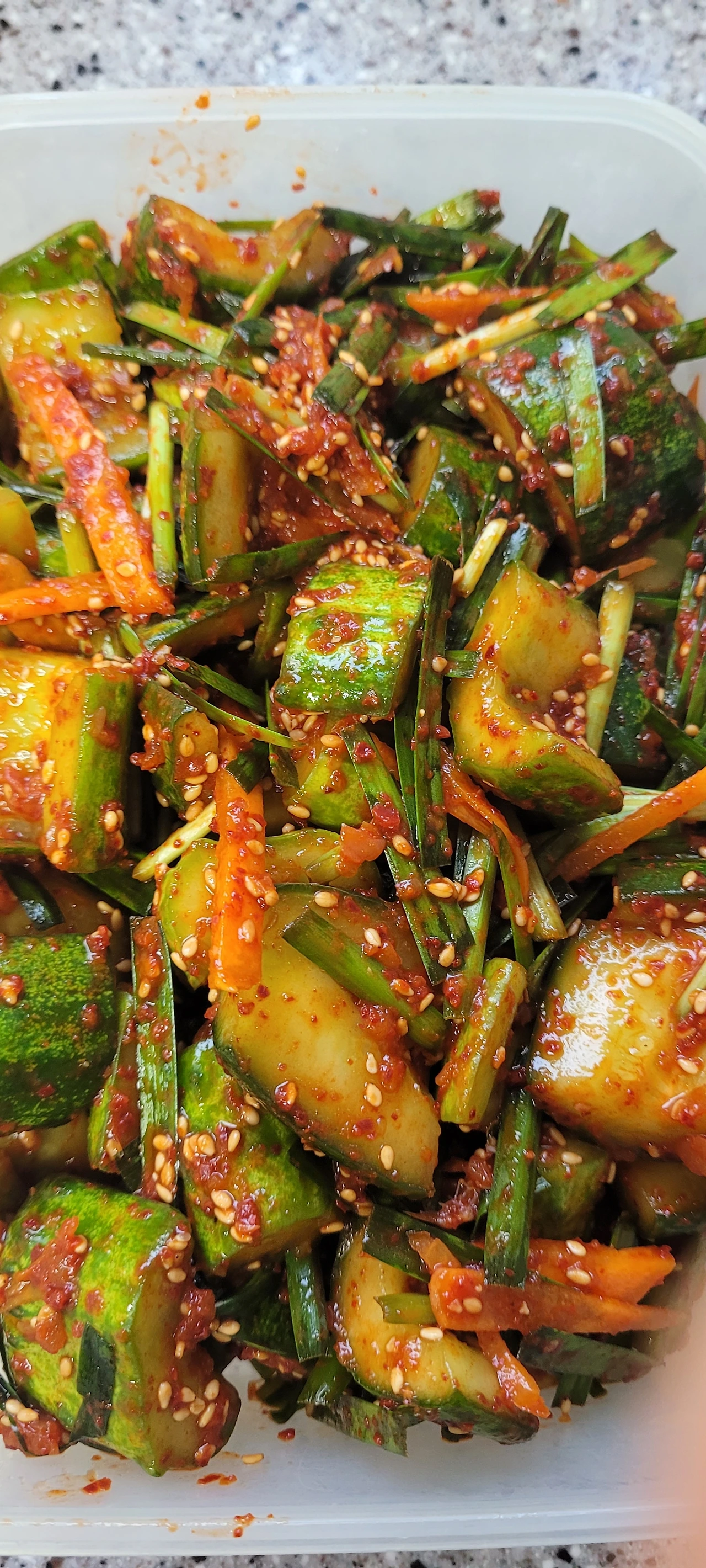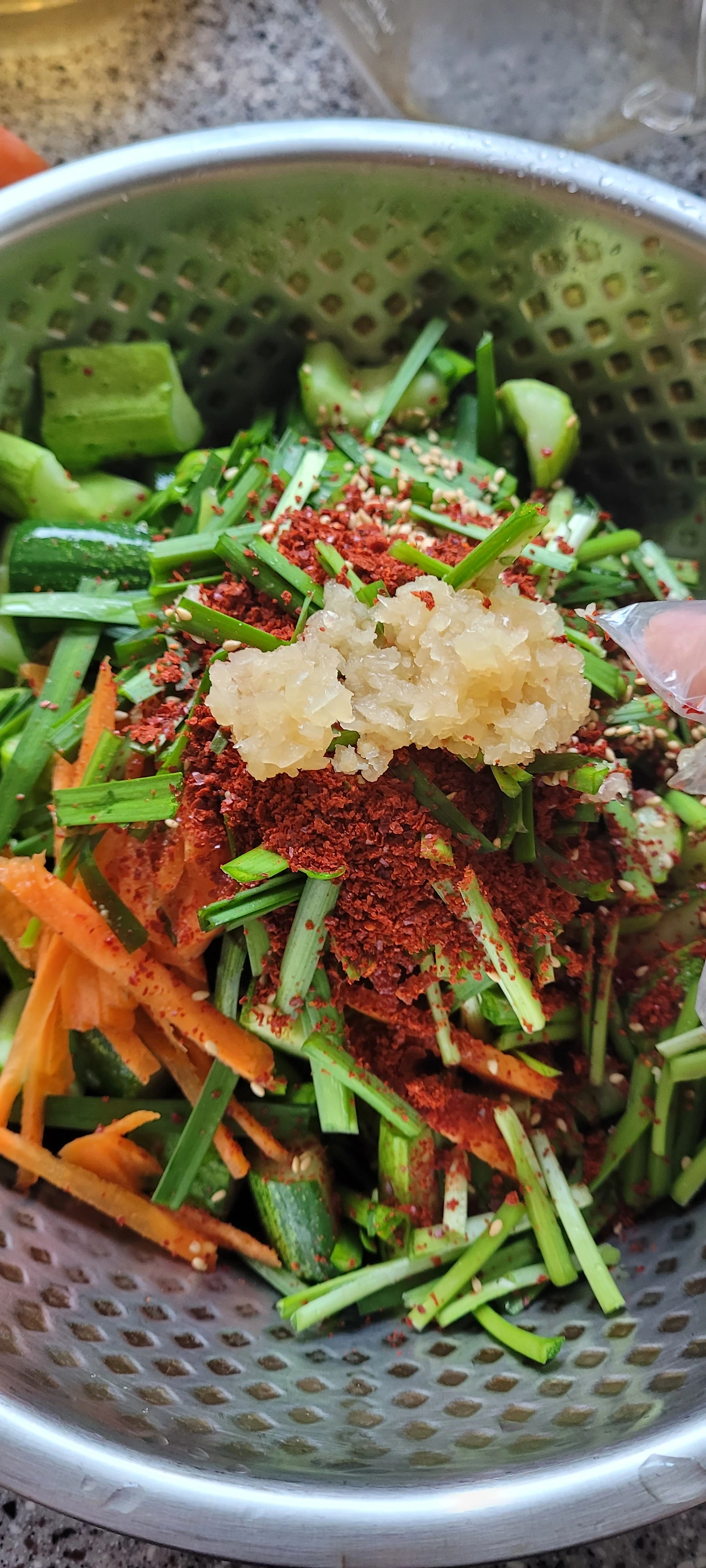 6. 물기 뺀 오이에 부추와 당근 썰어놓은 것을 넣은 뒤에 고춧가루 4T, 새우젓 1/2T, 멸치액젓 2T, 다진 마늘 1T, 미원 한 꼬집 그리고 마지막으로 통깨 뿌려 버무리면 끝.