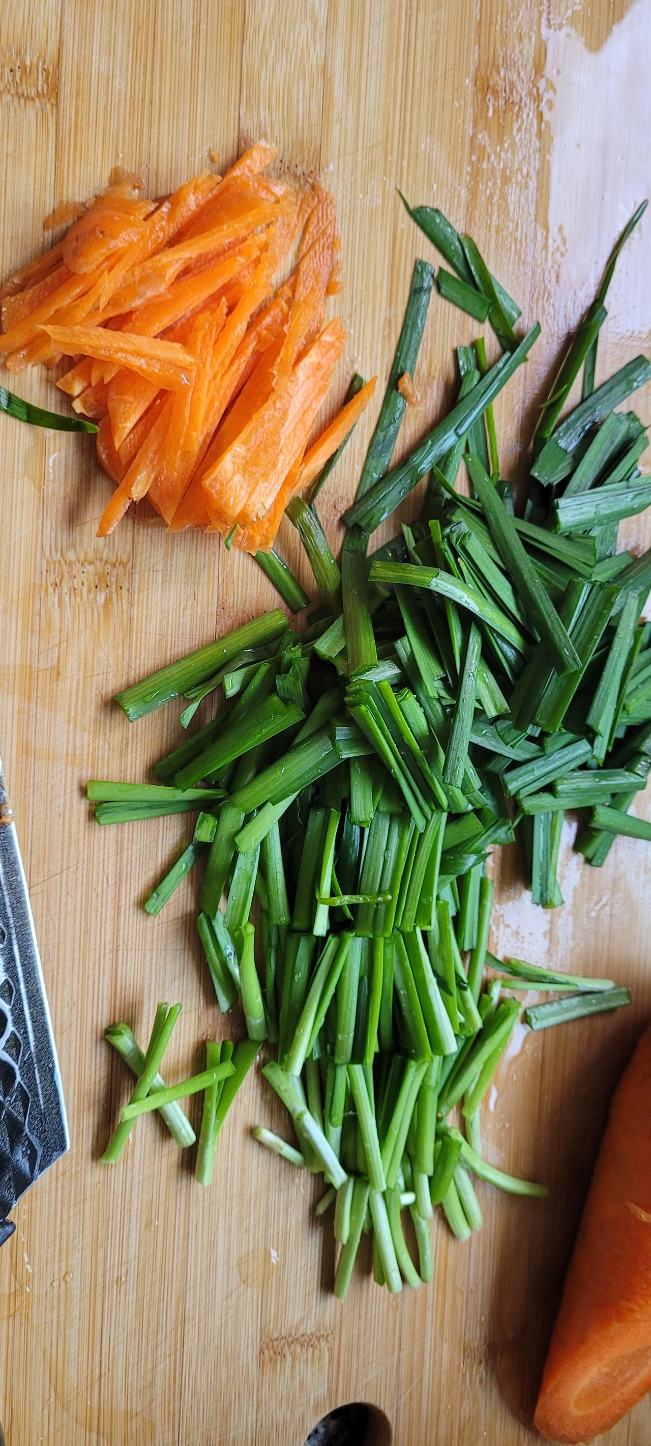 5. 부재료인 부추 한 줌과 당근 조금을 채 썰어 줍니다.