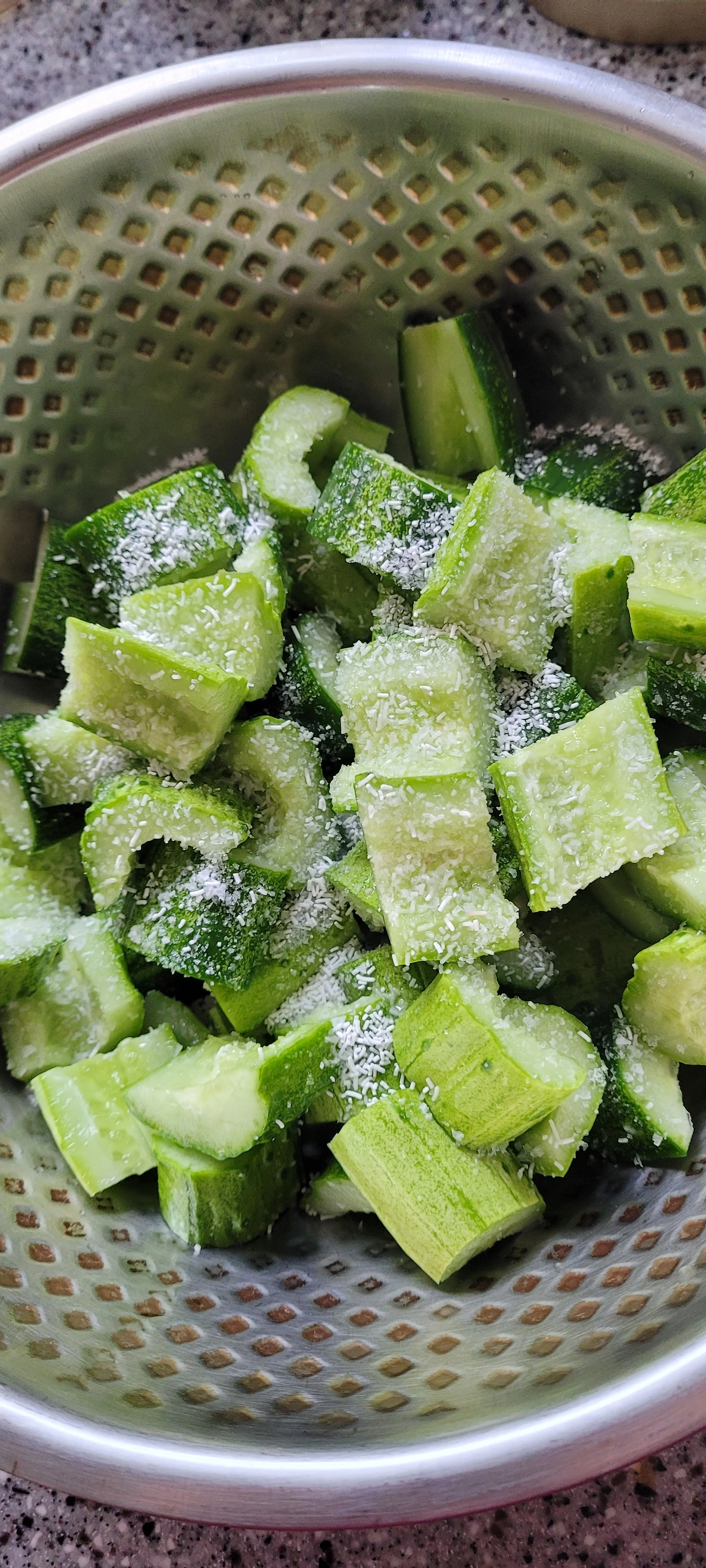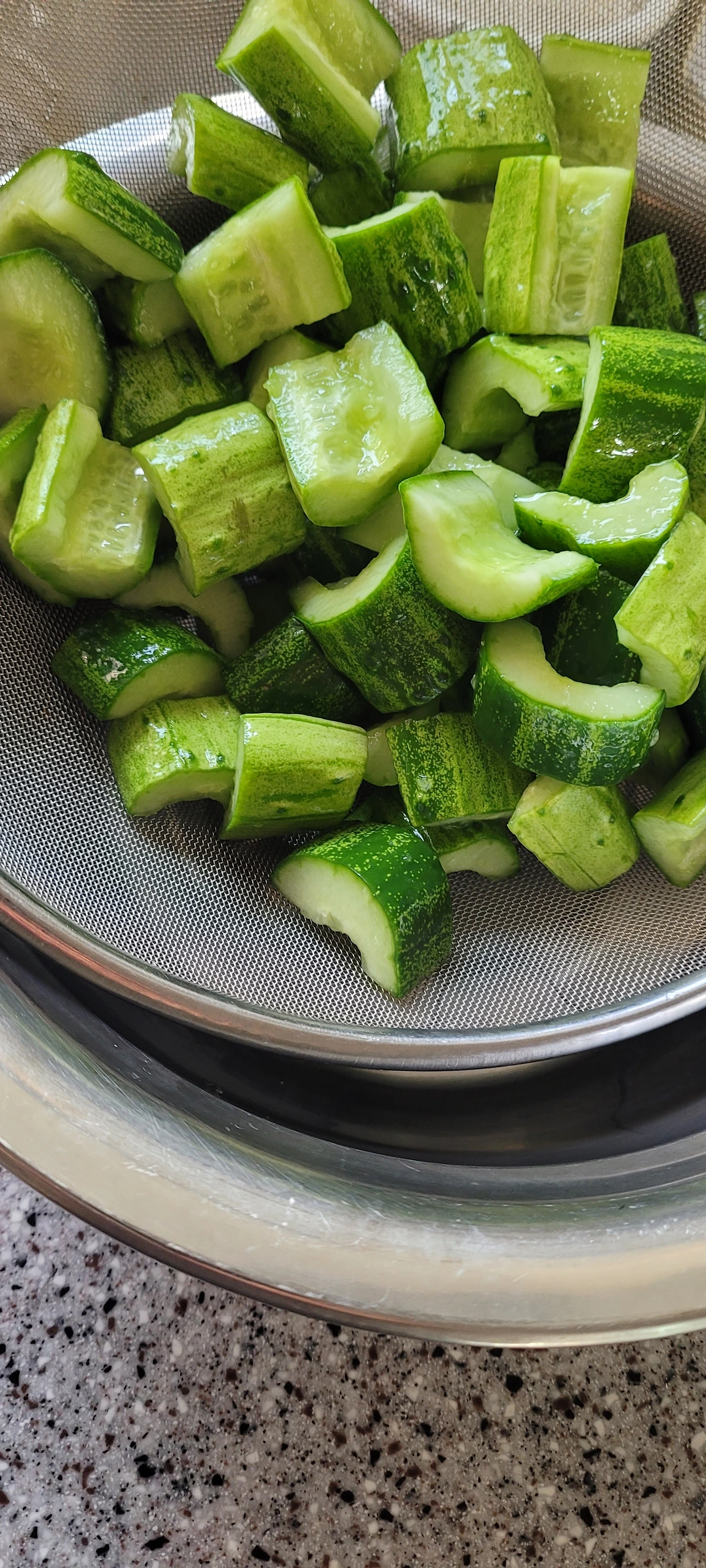 4. 살짝 절여진 오이를 세척하지 말고 그대로 채반에 옮겨 물기를 빼줍니다.