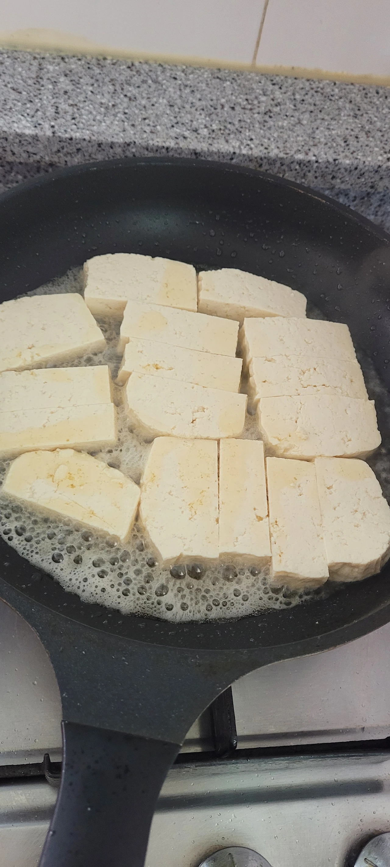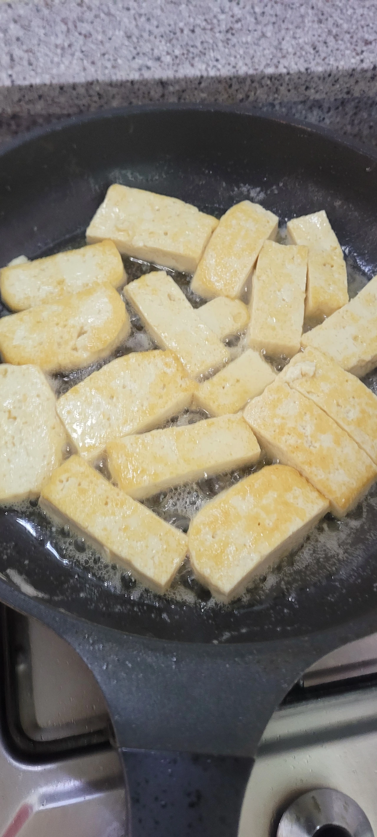 1. 팬에 들기름 2T, 식용유 1/2T를 두른 뒤에 두부 반모를 약불에 양면을 굽습니다.