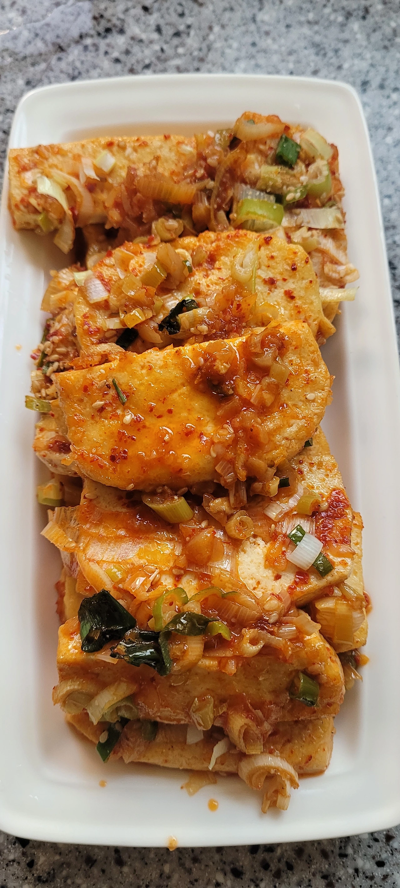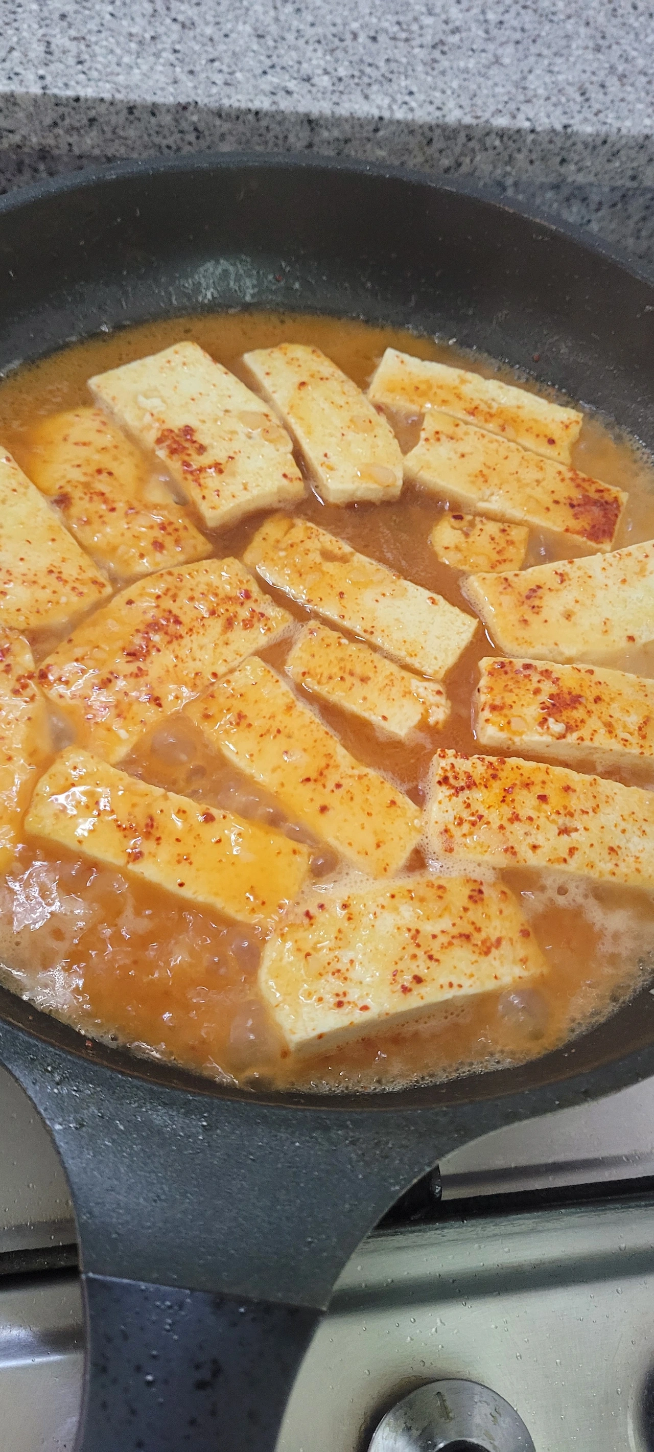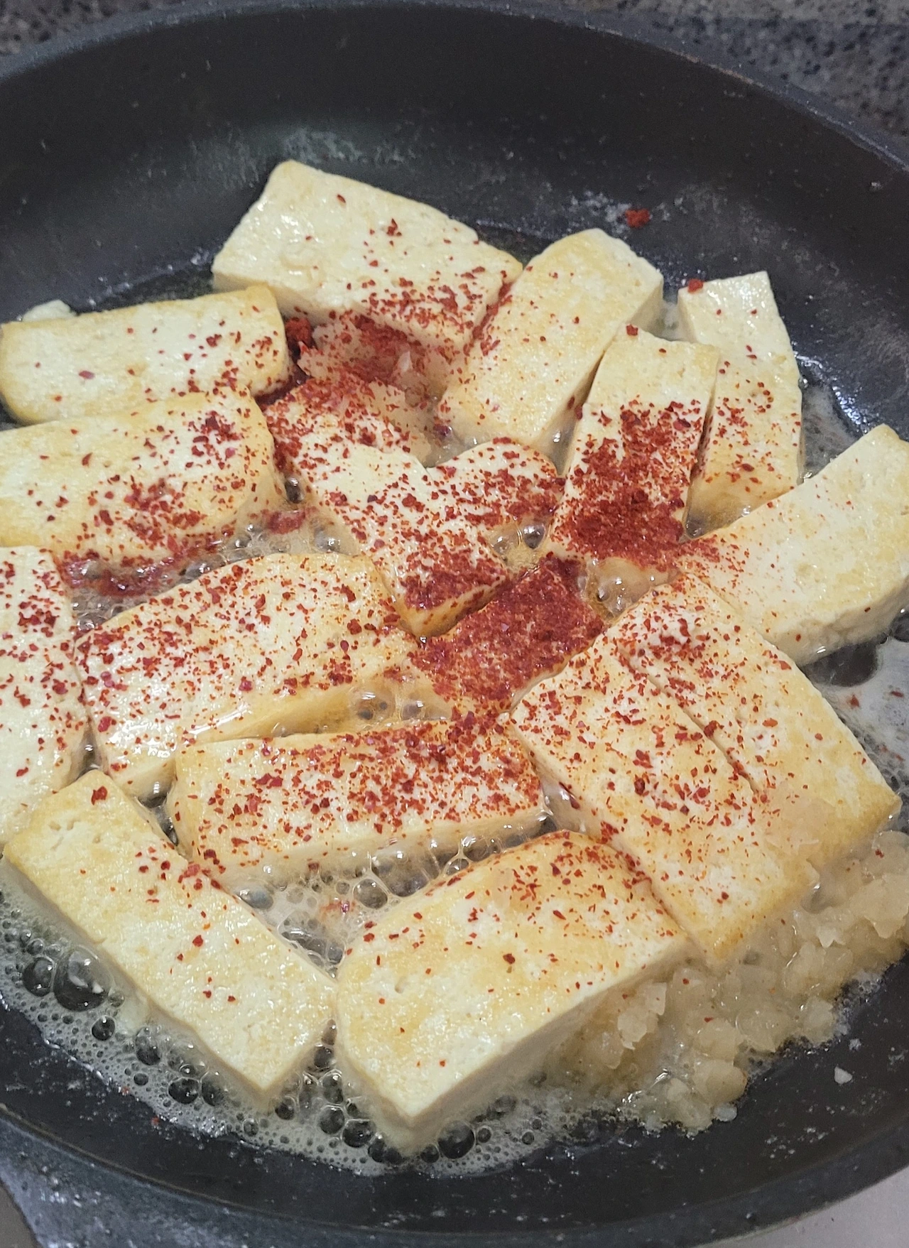 고기를 볶아서 넣어도 좋고 깻잎이나 고추를 썰어 두부와 칼칼하게 먹어도 좋지만 오롯이 두부만 빛나게 하는 쉬운 방법을 소개합니다. 들기름을 먹은 부드러운 구운 두부에 살짝 양념을 하는 방법입니다. 원팬으로 끝나는 요리입니다.