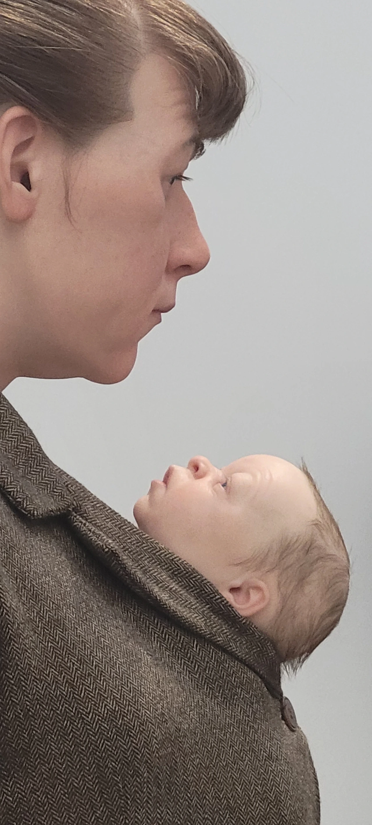 '쇼핑하는 여인'은 미술사에서 중요하게 다뤄온 '어머니와 아이'라는 주제를 현대적으로 해석한 작품일 수 있다. 론 뮤익은 평범한 거리의 한 장면에서 보편적이면서도 시대를 초월하는 깊은 감성을 포착했다. 여성은 커다란 외투 속에 거의 보이지 않는 아기를 아기띠로 안고 있다. 두 손은 묵직한 장바구니를 들고 있어 무게가 손을 파고든다. 이에 반해 아기의 작은 손가락은 간절하게 그녀의 가슴 위에 얹혀 있고, 아기는 여성의 시선을 붙잡으려는 듯 올려다본다. 그러나 여성은 생각에 잠겨 다른 곳을 바라보고 있는데, 우리는 그 생각이 무엇인지 모르면서도 공감할 수 있다.