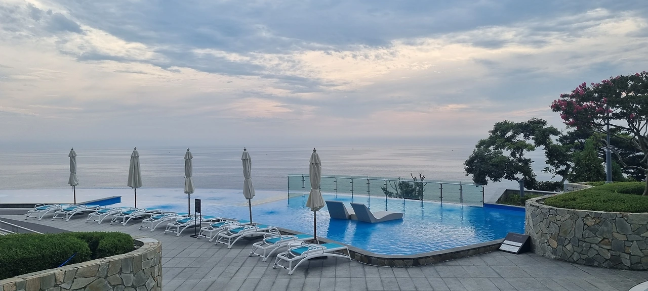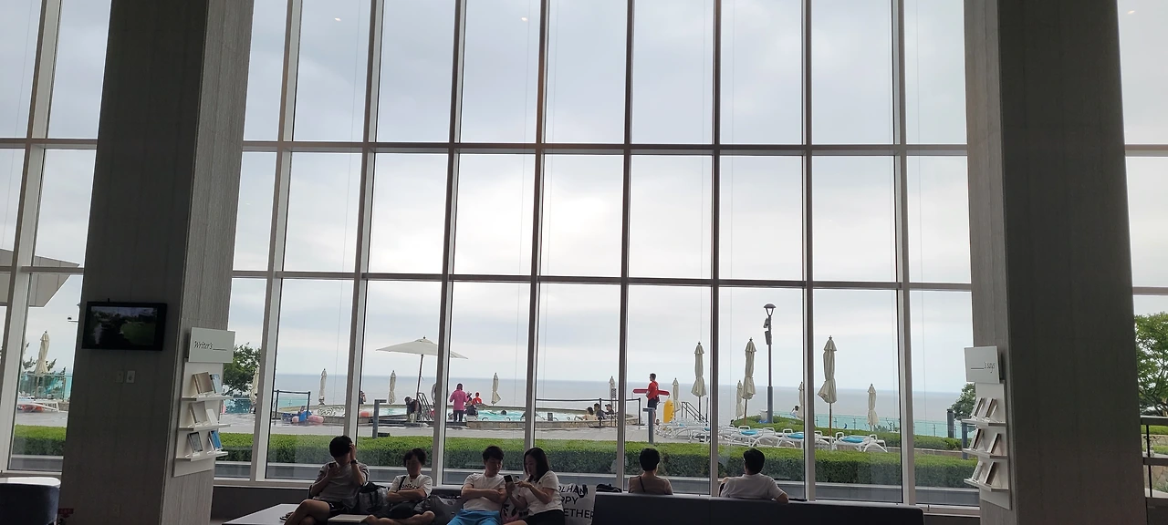 우리는 체크인시간을 훌쩍 넘어 도착해서 오히려 한산하고 순조롭게 입장할 수 있었습니다. 시야를 시원하게 만드는 객실의 탁 트인 뷰와 먼저 도착해 인피니트 풀에서 즐겁게 여가를 보내는 사람들은 이미 우리들의 모습이었습니다. 남향의 뜨거운 태양을 책임지며 서있는 건물 아래 인피니트 풀장으로 서둘러 우리는 이동했습니다.
