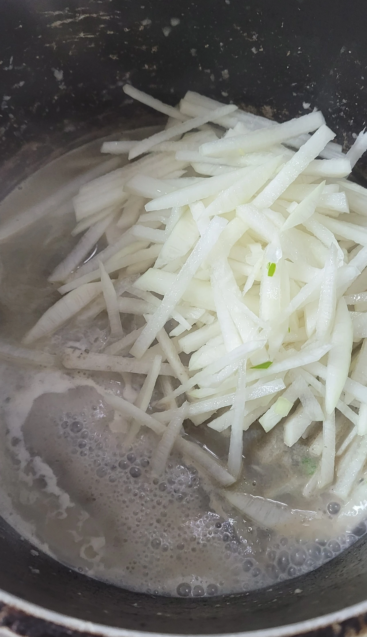 4. 굴에서 나온 수분에 채 썬 무를 넣고 2분가량 볶아줍니다.(중 약불)