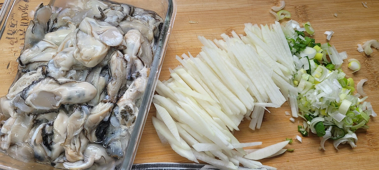 1. 굴을 깨끗이 씻어 준비하고, 무는 채 썰어 놓고, 대파는 잘게 썰어둡니다.