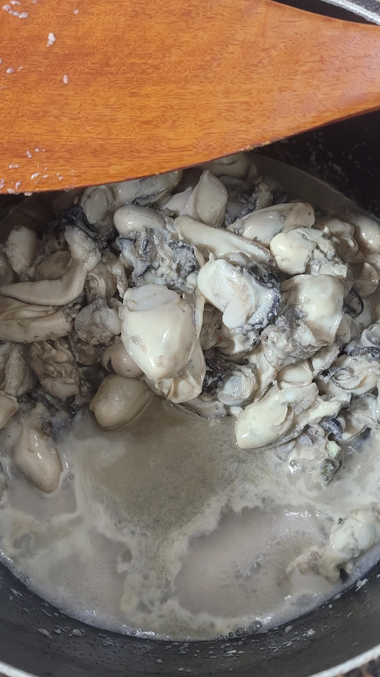 3. 굴이 탱글탱글 해지고 수분이 나오면 굴은 따로 건져냅니다.