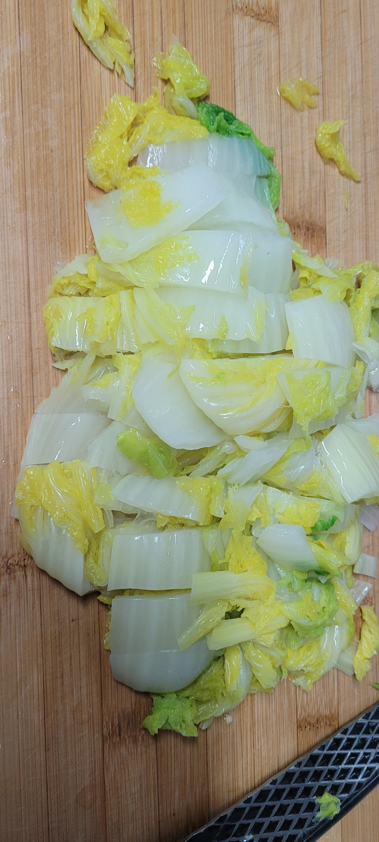 3. 건진 알배추는 찬물샤워 시키고 물기를 짜낸 뒤에 먹기 좋은 크기로 썰고 볼에 옮깁니다.
