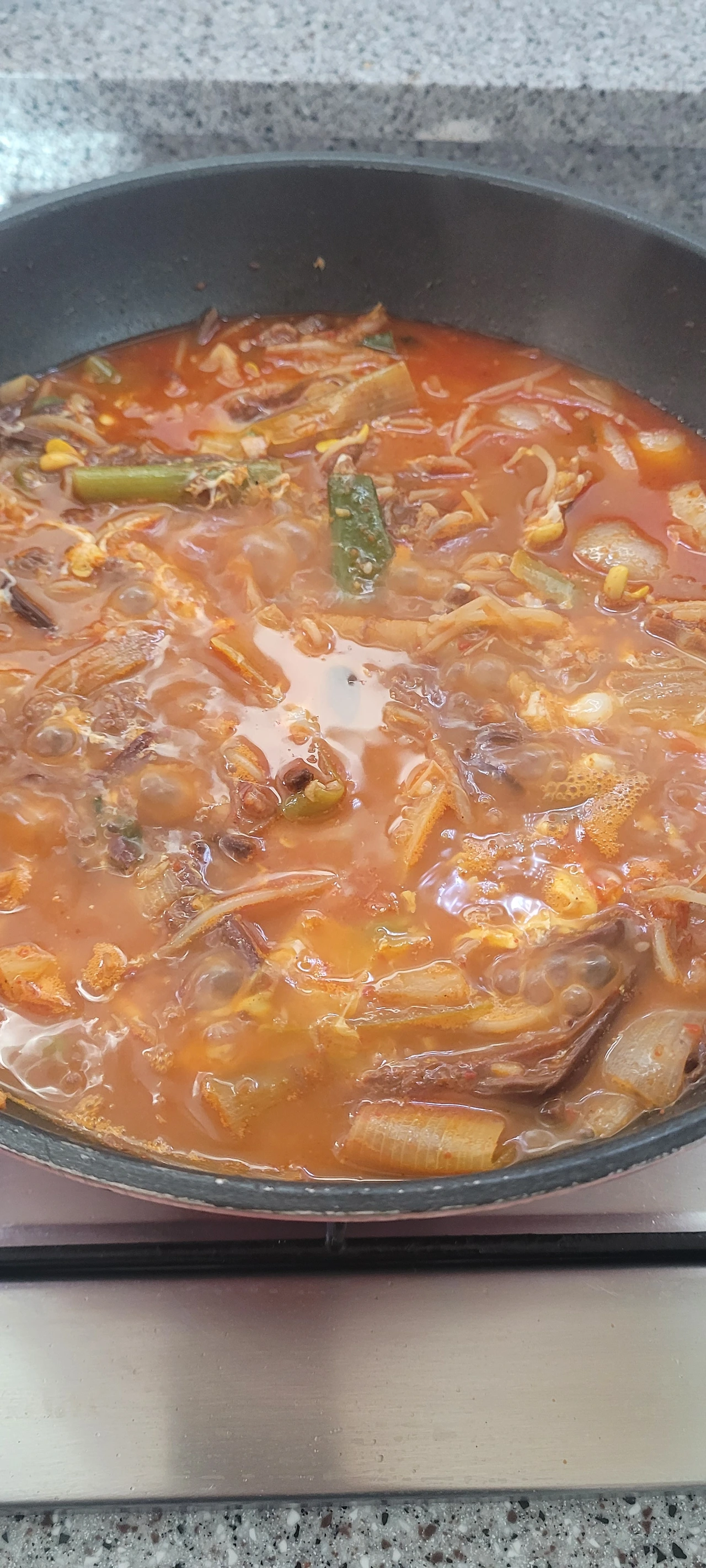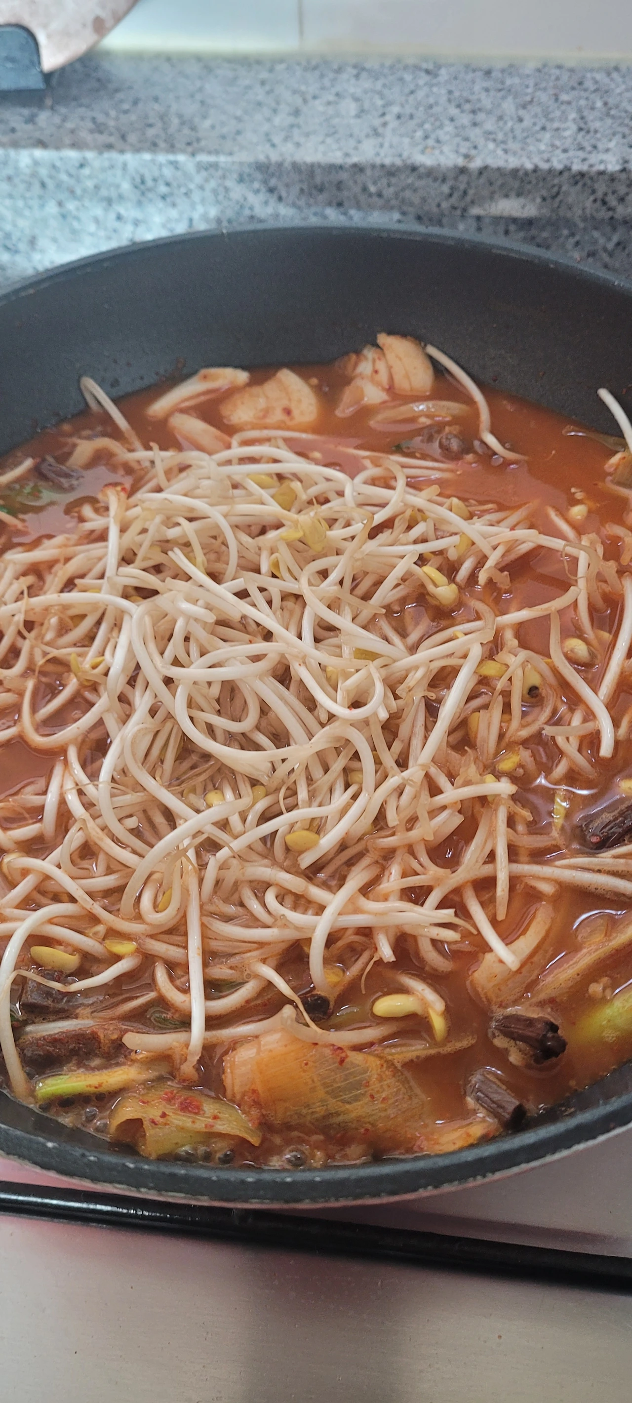 5. 다시 한번 끓을 때 콩나물 한 줌 넣어주고 뚜껑을 닫고 약불로 10분 정도 끓입니다.