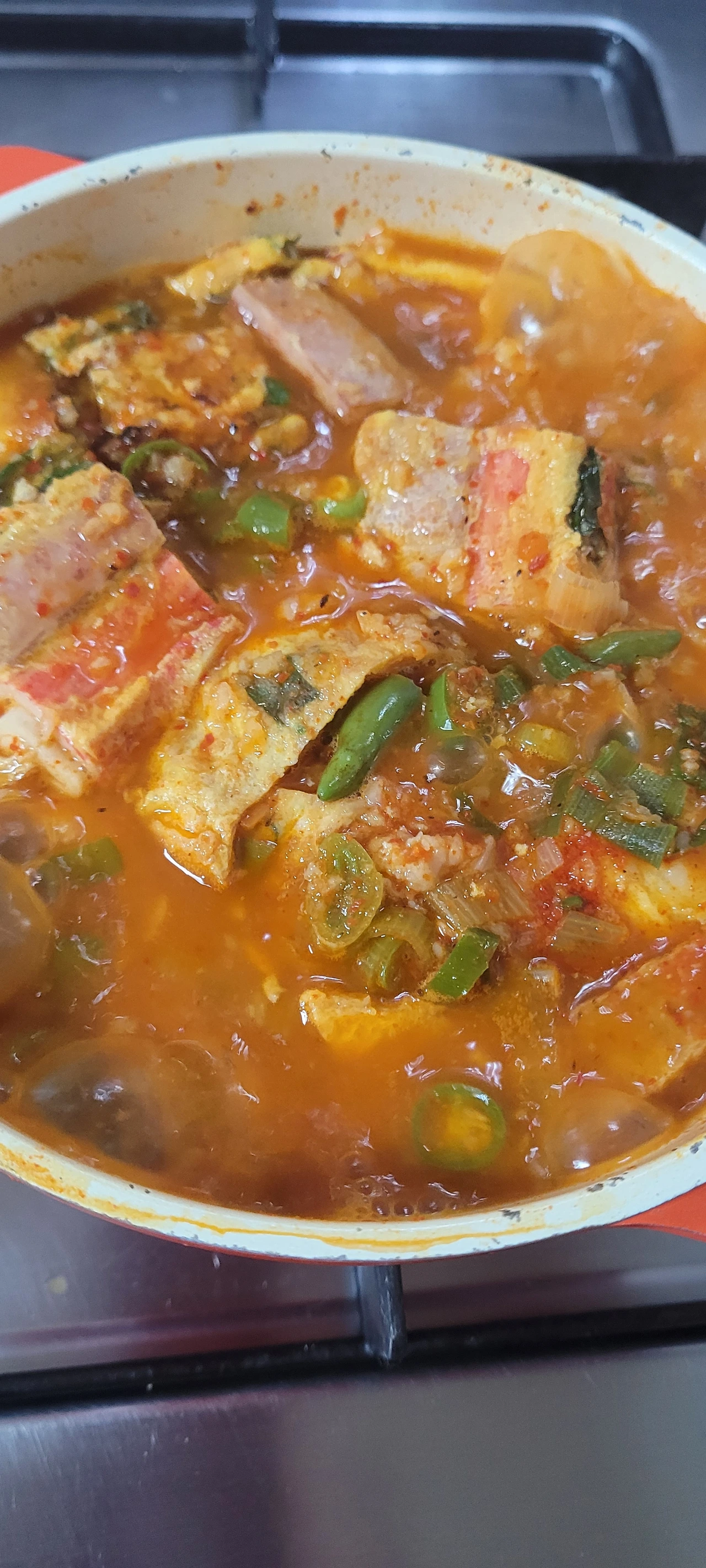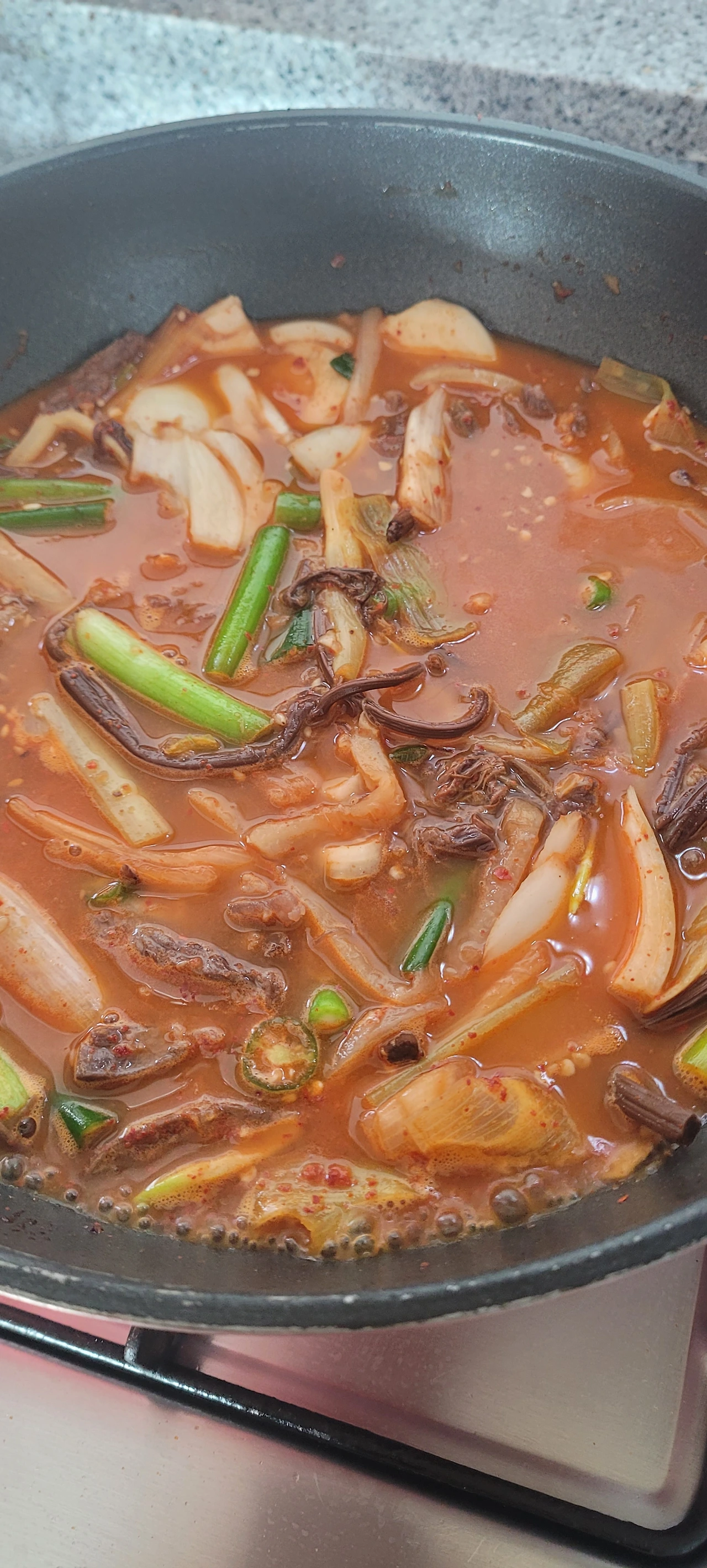 전골은 콩나물이나 알배추 같은 채소류와 함께 넣고 끓이면 맛있고, 그냥 저처럼 양파와 땡고추만 넣고 끓여도 충분합니다. 양념장은 기본 베이스로 하는데요. 만들기도 쉽고 식구들도 모두 만족하며 맛있게 먹고 있습니다. 멸치코인 있으면 넣으셔도 좋고 그마저도 귀찮으면 참치액 한 스푼 넣어줘도 맛있게 완성됩니다.