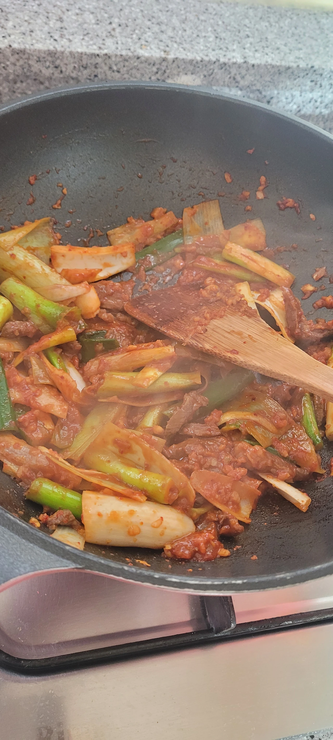 1. 웍에 참기름 2T를 두른 뒤에 소고기산적과 대파 크게 2대 썬 것을 넣고 볶다가 고춧가루 1T와 고추장 1T를 넣고 볶아줍니다.