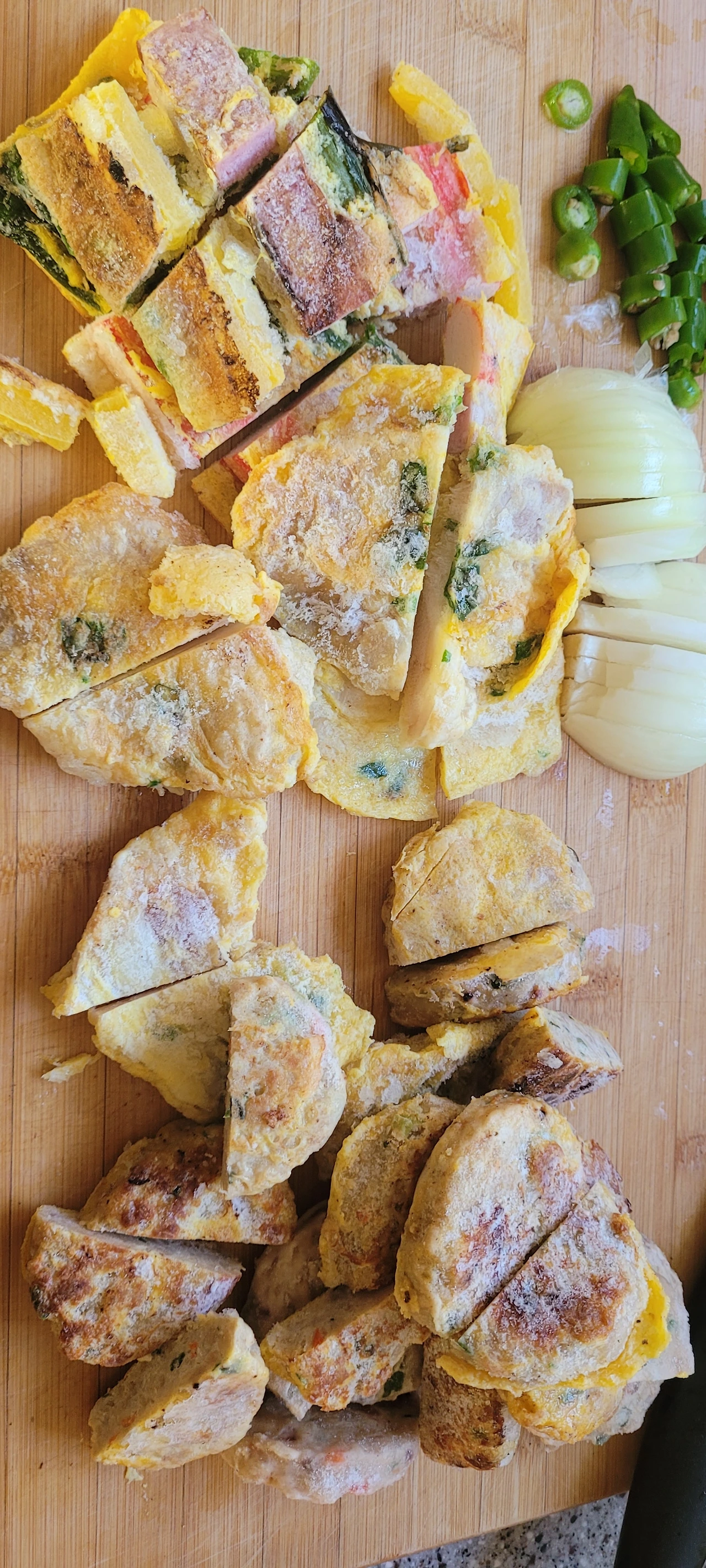 재료: 남은 각종 전들(먹을 만큼), 양파 1개, 땡고추 3개, 대파 한 줌