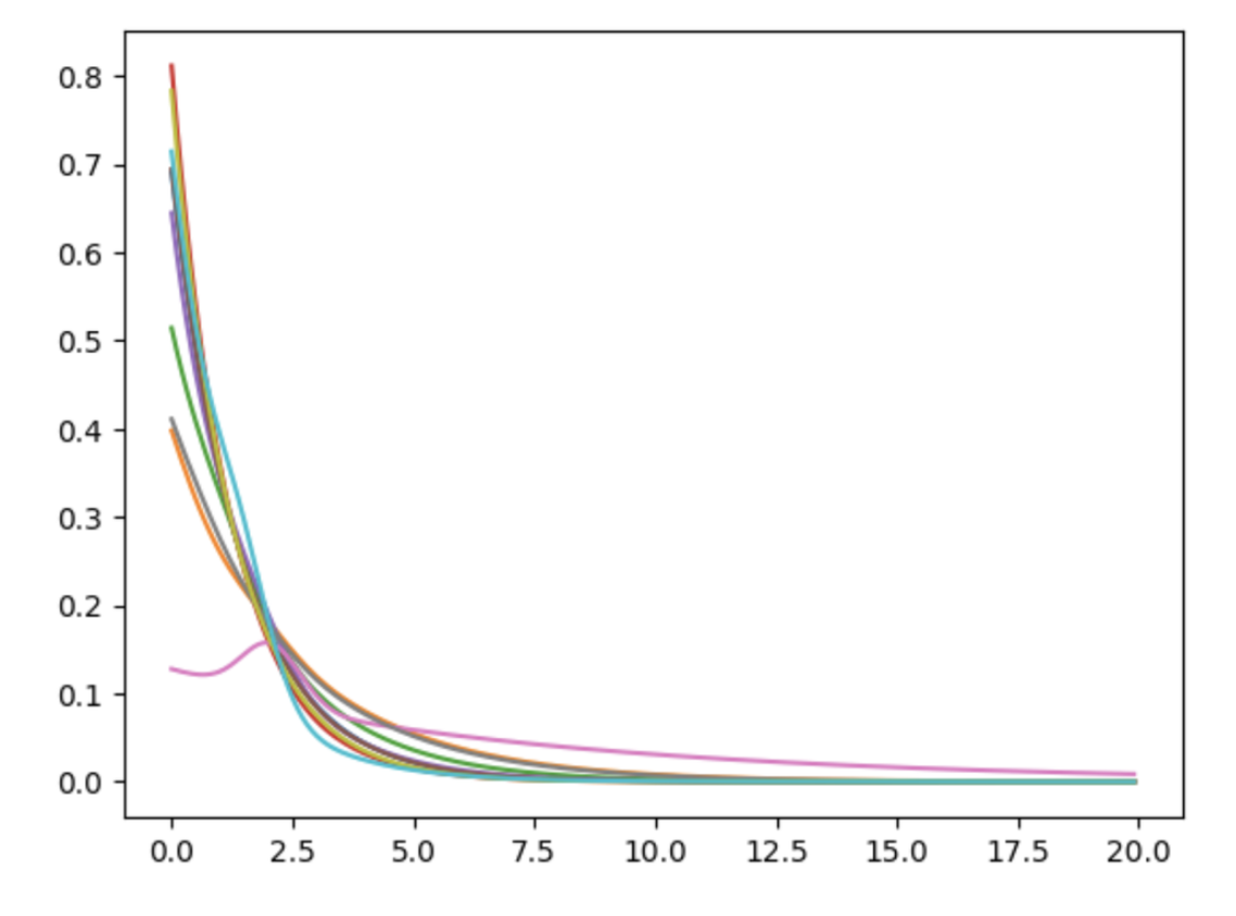 추가적으로 임의로 N명을 추출하여 Intensity Function을 시각화해보았습니다. 그 결과 대다수의 사용자가 지수분포를 따르는 결과가 도출되었습니다. 이는 모델이 많은 사용자들이 동질적인(Homogeneous) 패턴을 보인다고 판단한 것으로 해석할 수 있습니다.