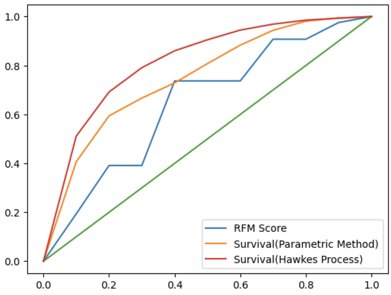 이번 Evaluation에서 ROC Curve의 경우 확률값(혹은 RFM Score)을 기준으로 정렬 후 전체 X% 유저를 추출하여 Target User의 몇%를 커버했는지를 표현하도록 하였습니다. 즉, 전체 20%의 유저를 추출하여 RFM Score 모델의 경우에는 구매유저의 40%유저를, Survival Analysis 모델의 경우 60%를 커버한 것으로 해석할 수 있습니다.