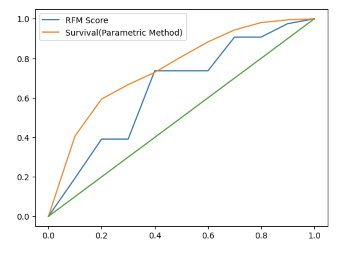 Evaluation의 결과는 AUC 값은 RFM Score기반 모델은 0.69, Survival Analysis 기반 모델은 0.75가 도출되어 RFM Score 기반 모델에 비해 Survival Analysis 기반 모델이 10% 더 좋은 성능을 보여주었습니다.