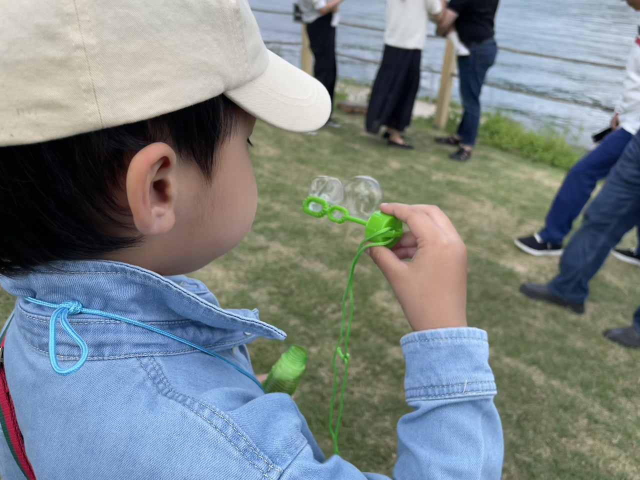 비눗방울을 쫓아 풀밭을 달리는 우주.