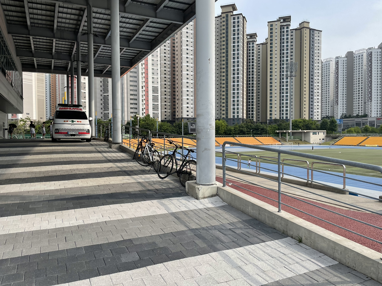 운동장 한편 대기 중인 구급차를 보며