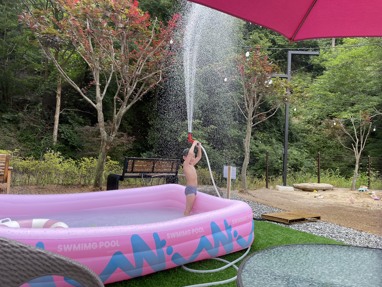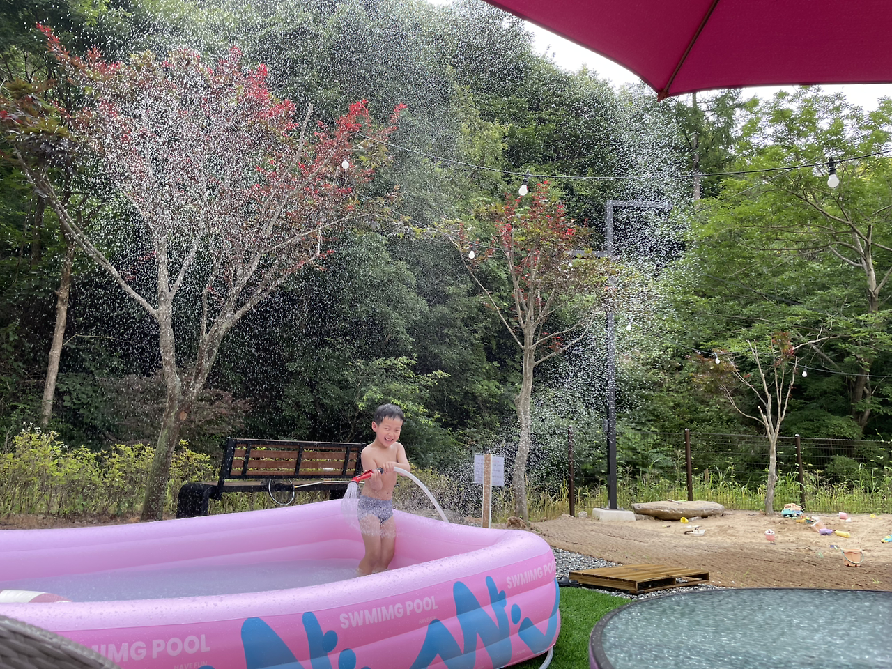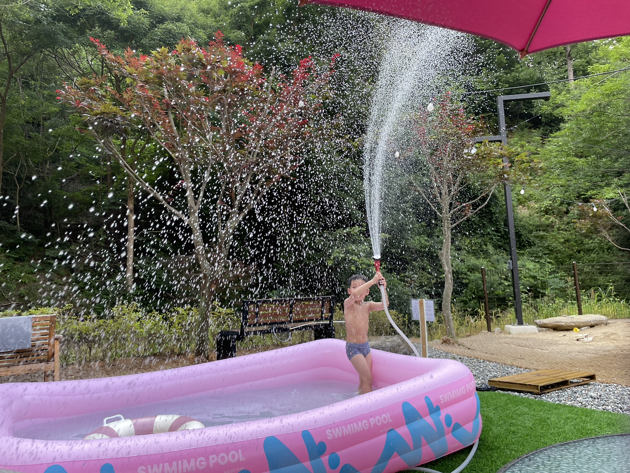 팡팡 터지는 물줄기가 인공 소나기처럼 쏟아졌다.