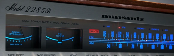 그 스피커 옆에 늘 함께 있던 앰프가 마란츠(Marantz) 2285B다. 이 기기를 이해하려면 '리시버(receiver)'라는 물건의 성격을 먼저 알아야 한다. 리시버란 앰프와 튜너가 하나의 몸체에 담긴 기기다 — 음악을 증폭하는 기능과 라디오 방송을 수신하는 기능이 합쳐져 있어, 이것 하나면 소스 기기와 스피커 사이의 모든 것이 해결된다. 1970년대에 마란츠, 파이오니아(Pioneer), 산스이(Sansui), 켄우드(Kenwood) 같은 회사들이 더 높은 출력, 더 많은 기능을 경쟁적으로 쏟아내며 리시버 시장을 전쟁터로 만들었고, 2285B는 그 전쟁에서 마란츠가 내놓은 가장 빛나는 무기였다.