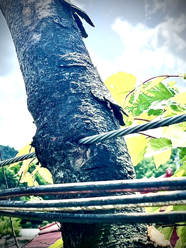 이 가지는 처음 자리를 잡고 뻗을 때는 별 문제가 없었을 겁니다. 그런데 시간이 지나 부피생장을 하다 보니 옆에 전깃줄을 지탱하는 와이어와 부딪히게 되었습니다.