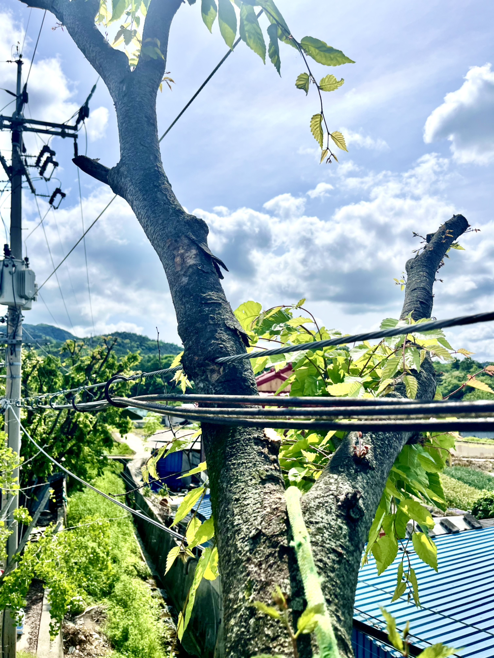 사실 도시나 시골이나 전선이 다니는 자리와 가로수를 심는 자리가 비슷하다 보니 전깃줄에 방해가 되는 가지 제거를 하는 일이 종종 있습니다.