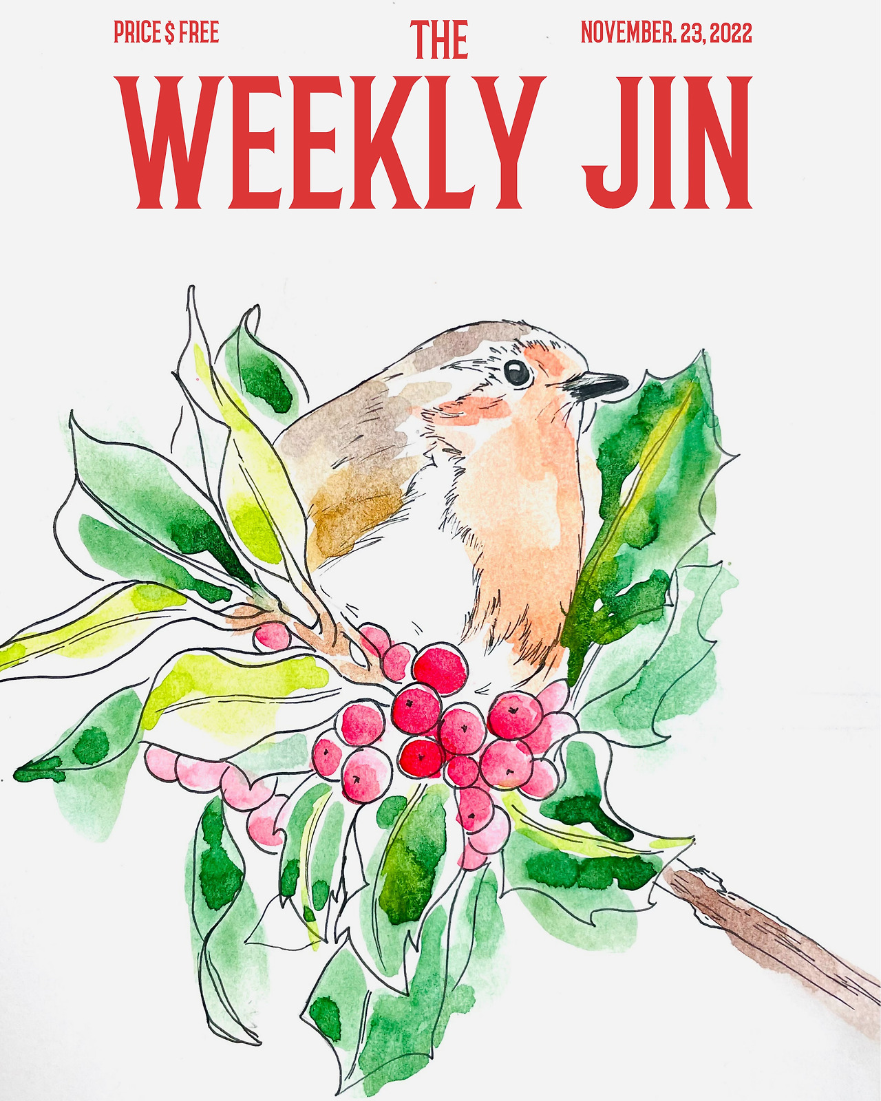 솔직해질 수밖에 없는 종이 위에서 어떤 사람도 줄 수 없는 긴장감과 편안함을 동시에 느낀다. 내가 나와 만나는 시간. 오늘의 부담은 바닥에 잠시 내려 두고, 소파 위에 무릎을 올리고 앉아 가장 좋아하는 캐롤을 틀어두고 노란 귤을 까먹으며 주황색 배를 가진 귀여운 녀석을 빨간 열매와 함께 그려본다. 오늘은 이런 나를 만나는 시간.