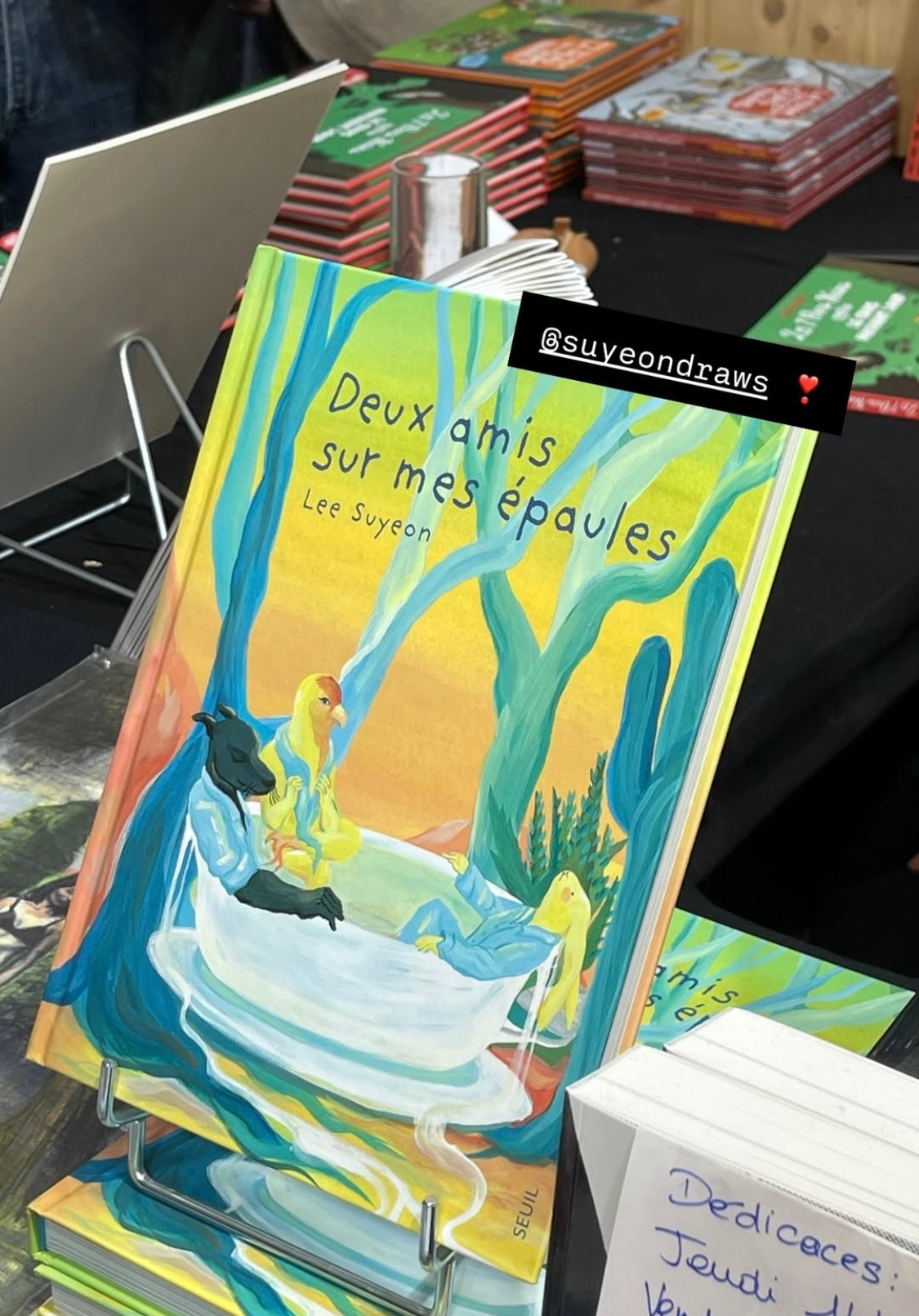 앙굴렘에서 바람북스 출판사에서 [내 어깨 위 두 친구] 프랑스판이 출판사 중앙에 전시되어 있다며 사진과 글을 보내주셨다. 분명히 수출이 되었다는데 세상 어딘가에 내가 쓰고 그린 책이 알아서 이렇게 돌아다니고 있다는 일은 참 새삼스럽게 기쁘다. 그리고 넋을 놓고 있는데 반가운 카톡이 왔다. 오래전부터 막연히 팬이었던 작가님과 묶여서 그룹 전시회를 하게 될지도 모르겠다. 역시 작은 희망이라도 바깥으로 꺼내놓고 표현하면 시간은 오래 걸리지만 분명히 힘이 있다. 나는 작년에 무심하게 '작가님과 묶여서 전시를 하게 된다면 우린 참 잘 어울릴 텐데요' 그런 말을 실제로 내뱉었기 때문이다. 카톡을 받고 힘이 나서 뭐를 전시하지? 뒤적거리다가 [내 어깨 위 두 친구]중 한 장면에 내가 써둔 글이 보인다.