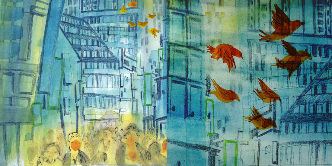 나 자신도 내가 왜 이렇게 노랑새를 자꾸 스케치북에 여러 번 거듭해서 그렸는지 알지 못했다. 잉크는 밝은 햇살 같은 오렌지 빛이 도는 노랑이었다. 회색 빛이 도는 푸른 도시 위로, 낡은 집들 위로, 때로는 소녀의 얼굴 위로, 손 위로 노란 새들이 날아다녔다. 몇 권의 스케치북에 꽤 많은 페이지에 같은 색의 잉크로 선이 없는, 면으로만 채워진 잠시 스쳐 지나가는 빛과 같은 흐리고 진한 노랑새 들이 여러 마리가 흩어져 있었다. 왜 이렇게 그린 걸까? 모르겠다. 그리고 나는 몇 년을 그 낙서들을 덮어두었다. 그리고 완전히 잊어버렸다.