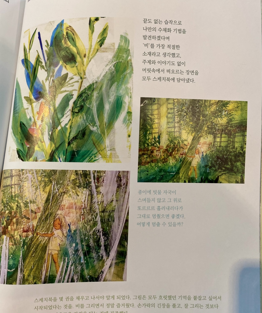 이 책의 그림을 그렸던 시기는 14년 전 대학원 시절이었다. 끝도 없는 습작으로 나만의 수채화 기법을 발견하겠다며 ‘비’를 가장 적절한 소재라고 생각했고, 주제와 이야기도 없이 머릿속에서 떠오르는 장면을 모두 스케치북에 담아냈다. 종이에 빗물 자국이 스며들지 않고 그 위로 또르르르 흘러내리다가 그대로 멈췄으면 좋겠다, 어떻게 멈출 수 있을까? 종이 위에 니스와 투명 매니큐어를 바르고 OHP 필름지를 살짝 붙여본다. 그렇게 투명한 레이어를 만들고 그 위에 하얗고 푸른 빗물을 마음껏 그리면, 그림과 필름지 사이에 빗물과 함께 옅은 그림자가 드리워졌다. 내가 손으로 그려낼 수 없는 비 그림자가 스캔할 때마다 무작위로 다른 농도로 얻어졌다. 어느 페이지에서는 방금 꺾은 나뭇가지의 향처럼 짙은 풀 향기가 나기를 바라면서, 길에 떨어져 있던 나뭇잎을 말려서 붙였다. 머릿속에 떠오르는 끊어진 장면들을 반복해서 그리고 또 그려냈다. 스케치북을 몇 권을 채우고 나서야 알게 되었다. 그림은 모두 흐릿했던 기억을 붙잡고 싶어서 시작되었다는 것을. 비를 그리면서 정말 즐거웠다. 손가락의 긴장을 풀고, 잘 그리는 것보다 편안하고 자유로운 감정을 담는 것에 집중했다. 작가의 말에도 적었지만, 그림을 그리다가 지칠 때마다 나는 이 책을 책장에서 꺼내 보게 될 것 같다. 이 풋풋한 초록의 기쁨들이 엮인 책을.