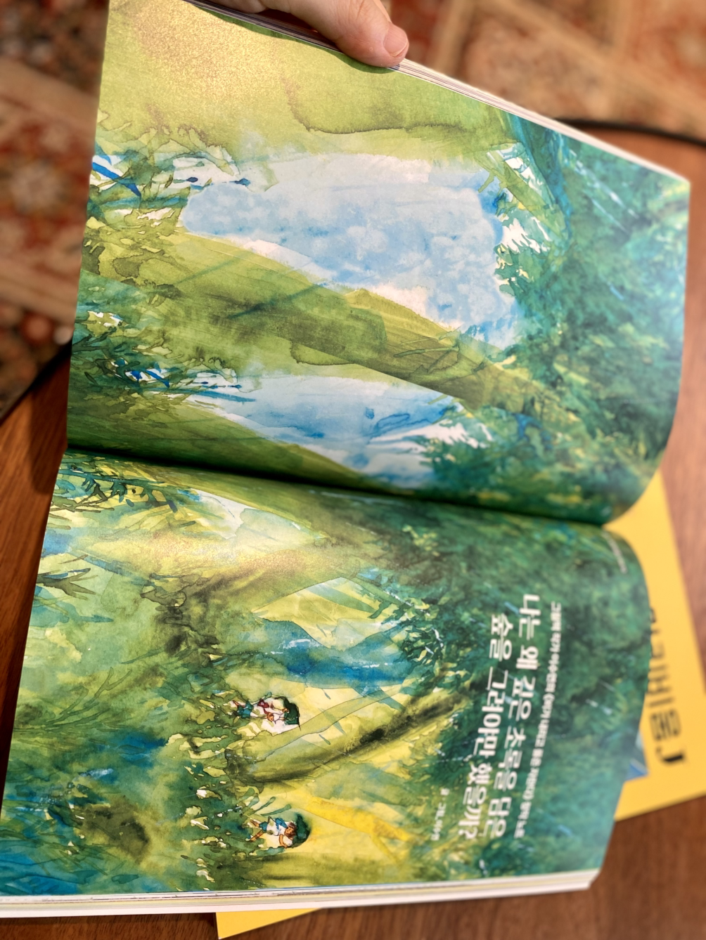 나에게는 이 책에 그려진 숲은 보이는 그대로 초록의 숲, 그 자체가 아니다. 공장 옆 오동나무 숲은 책에 그려낸 만큼 크거나 웅장하지 않았다. 어떤 리뷰에서 이 그림책을 ‘천 개의 초록’이라고 써주셨다. 나는 왜 이렇게 깊은 초록을 담은 숲을 그려내야 했을까? 나에게 숲은 어른이 되고 나서 뒤돌아본 어린 시절의 끝을 모르고 뻗어가는 한없이 커다란 희망이자 꿈이기 때문이다. 길벗어린이에서 2024년 4월에 출간된 [어쩌다 보니 가구를 팝니다]에 이루지 못한 자신의 꿈을 찾아 떠나는 곰사원에게 성실하고 우직하게 자리를 지켜내는 개사원이 이런 말을 한다. ‘모두가 다 꿈을 가지고 그 꿈대로 사는 건 아니야. 누군가는 이렇게 나처럼 살아가. 주어진 삶을 충실하게 지켜나가는 것도 꿈을 꾸는 것만큼 아름답다는 걸 이제는 알 것 같아.’ 우리는 숲 안에서 자유롭게 뛰어놀았던 시간을 뒤로하고, 예상했던 것보다 너무 빠른 속도로 커버렸고, 그러다 무언가를 놓치고 포기하며 그렇게 어른이 되었다. 살다가 어떤 날, 아, 어릴 때 나는 그런 삶을 살고 싶었는데. 그렇게 아쉬움과 쓸쓸함을 안고 뒤돌아보는 날들이 있다. 그러다가도 지금의 내 자리에 나름의 의미와 가치가 있다는 것을. 이곳으로 오기 위해 그런 싱그러운 초록의 꿈이 있었던 것이라고 웃음 짓는 평화도 있다.