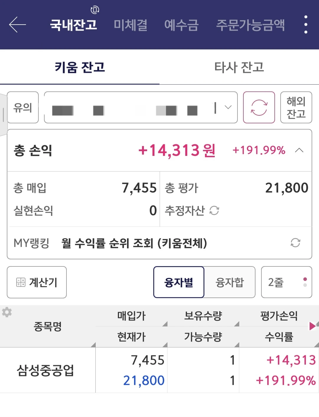 소수점 주식 이벤트로 받았던 삼성중공업. 그 미미한 단주가 무려 +190%를 기록하고 있었습니다. 금액은 거의 의미가 없는 수준이었지만, 수치만큼은 눈을 의심하게 만들었죠.