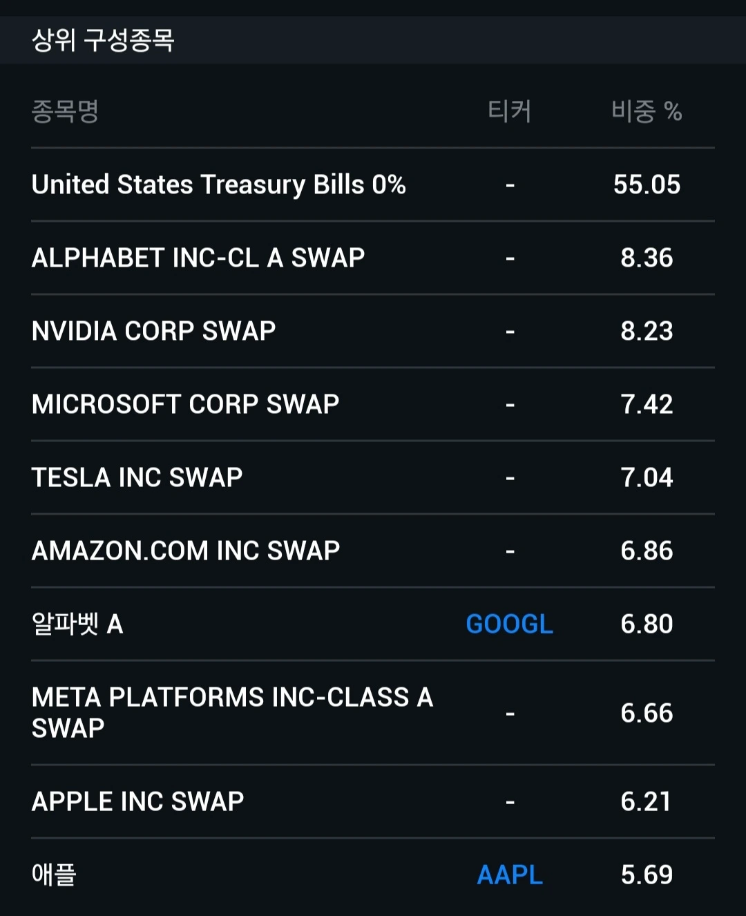 하지만 그것은 진짜 비중이 아니라 담보 같은 존재입니다. ETF는 스왑 계약을 통해 실제로는 빅테크 주식의 움직임을 그대로 따라갑니다.
