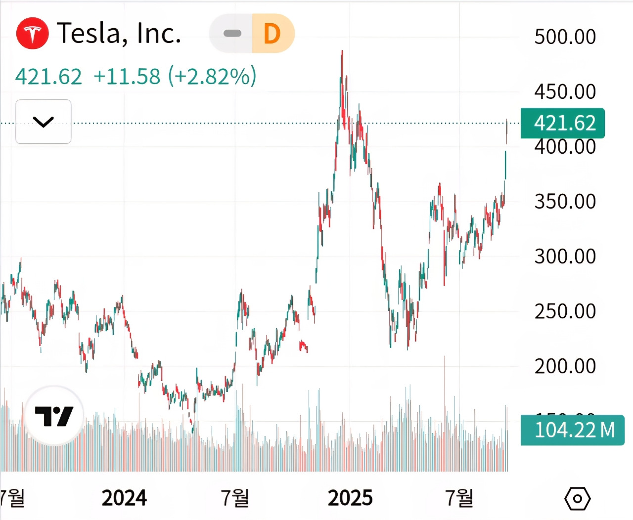 테슬라가 정말 많이 올랐습니다. 최근 조금씩 오르더니 지난주 금요일에는 폭등했고, 주말인 일요일까지도 상승세가 이어졌습니다.