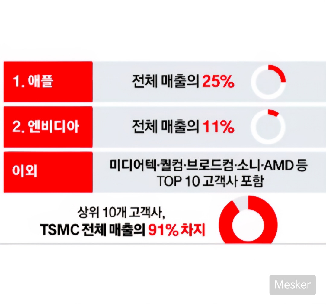 작년에도 25% 가까이를 차지하며 무려 28조 원 규모를 만들어냈죠. 결국, 애플은 TSMC의 첫 번째이자 가장 든든한 파트너로 남아 있을 겁니다.