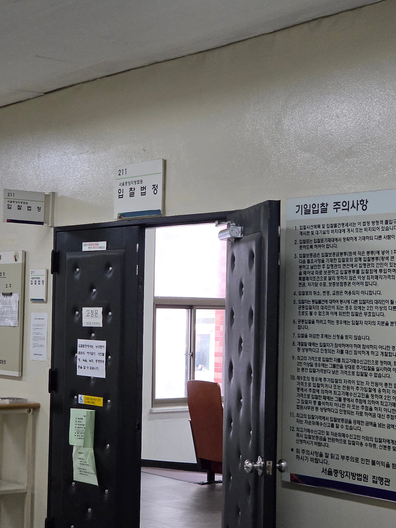 다만, 배워 놓으면 쓸모 있을 유용한 기술이라 생각하기에 앞으로도 관심을 두고 공부할 생각이 있습니다. 처음 입찰을 하는 날에 실수를 할 수도 있으니 입찰은 하지 않고 경매가 어떻게 진행이 되는지 과정을 알아보기 위해 법원에 들렀습니다. 백번 듣는 것보다.. 역시 한번 보는 것이 더 좋습니다. 각종 종이 구석구석에 실수를 할만한 요소가 많이 있더군요. 이번에 한 번 경험해 봤으니 실제로 입찰을 할 때는 부담감 없이 도전해 볼 만하다는 생각이 듭니다.