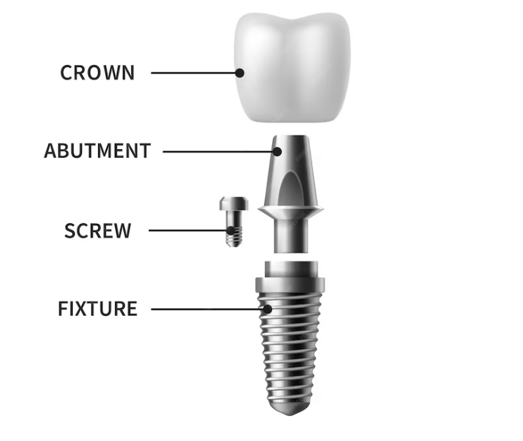 픽스처(인공 치근) : 뼈 안에 넣는 인공 치근이며 주로 티타늄으로 만들어집니다.