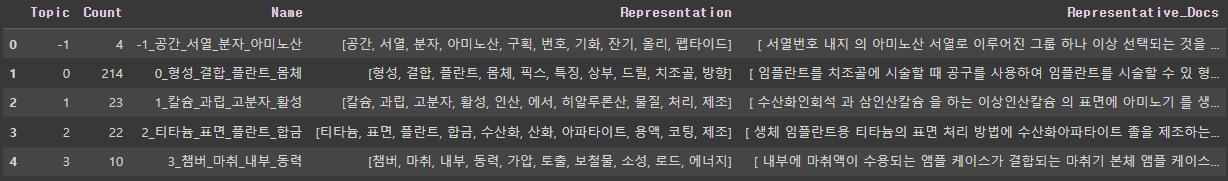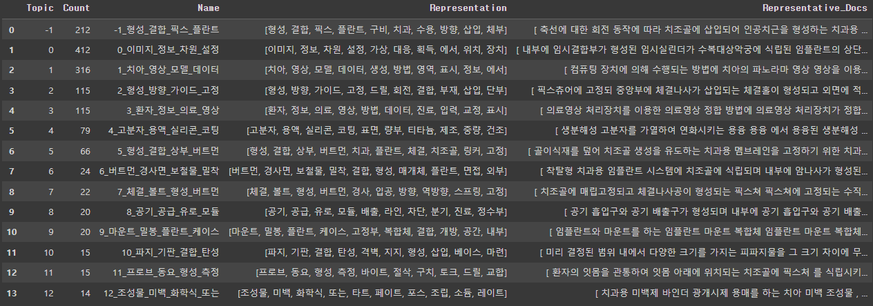 따라서 위와 같이 전처리를 해주고 BERTopic 알고리즘으로 토픽을 분석해 보면 아래의 결과가 도출됩니다.