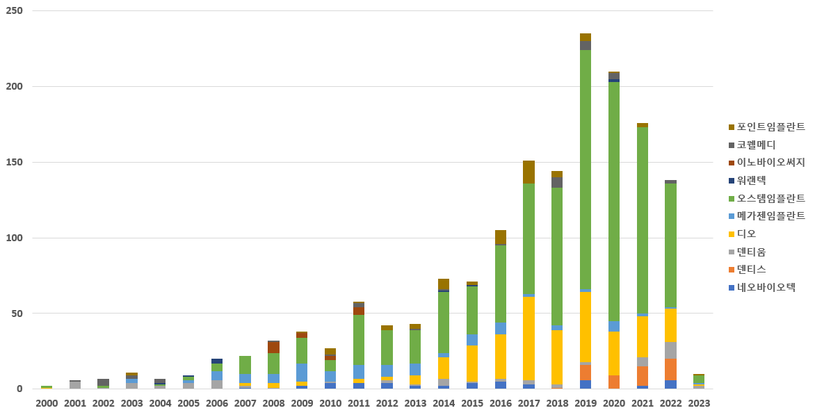 위에서 언급한 국내 임플란트 기업 10곳의 국내 특허 출원 동향을 살펴보니 2000년을 시작으로 점점 증가하는 추세를 보이다가 2019년에 정점을 찍고, 2020년부터는 점점 감소하는 추세를 보여주고 있습니다. 아마도 코로나-19의 여파로 연구개발비용을 축소하면서 자연스럽게 특허 출원수도 감소한 것으로 생각됩니다. (23년도에는 특허 출원 후 1년 6개월이 지나지 않은 건들이 반영되지 않아 수치가 낮게 나오는 점 참고 바랍니다.)