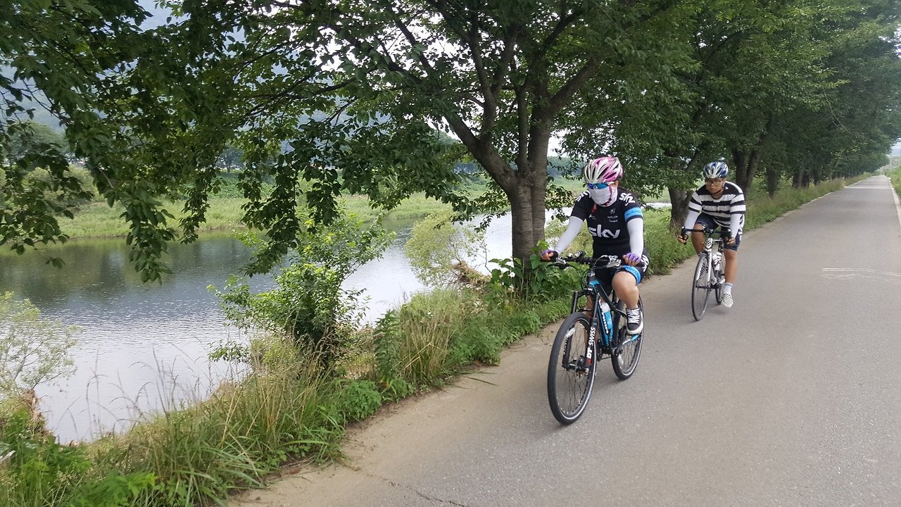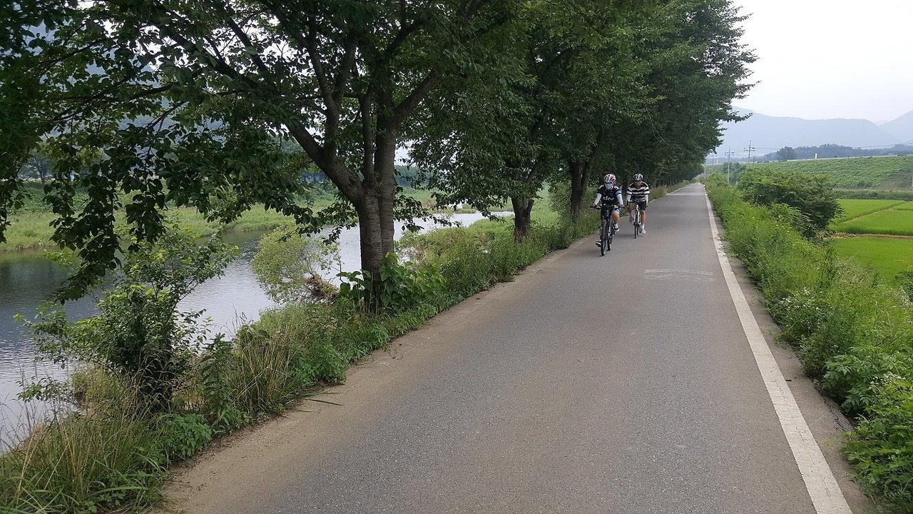 마성면 냇가 길을 따라서 여유롭게 달렸다. 나무들이 쭉 줄지어 있는 냇가 쪽으로 바짝 붙어 갔다. 나무들이 가져다주는 그늘이 우리에겐 고마운 선물이었다. 길옆으로 푸른 벼들이 한 폭의 풍경화처럼 펼쳐졌다. 보기만 해도 시원하고 마음이 푸르러졌다.