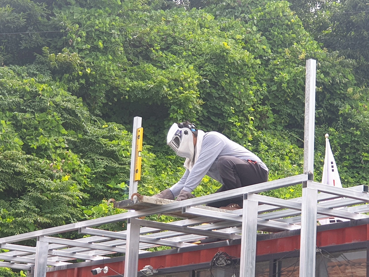 뙤약볕의 더위에도 불구하고, 자신의 프로젝트를 완성하기 위해 열심히 용접하는 남편. 일단 가접을 해 놓고 본격적인 용접을 한다고 했다. 이 더위에 용접도 문제지만, 모든 각관의 길이를 정확하게(오차없이)재단하는 것도 문제였다. 더군다나 일일이 수평계로 수평을 맞춰나간다는 것도 힘들었다.