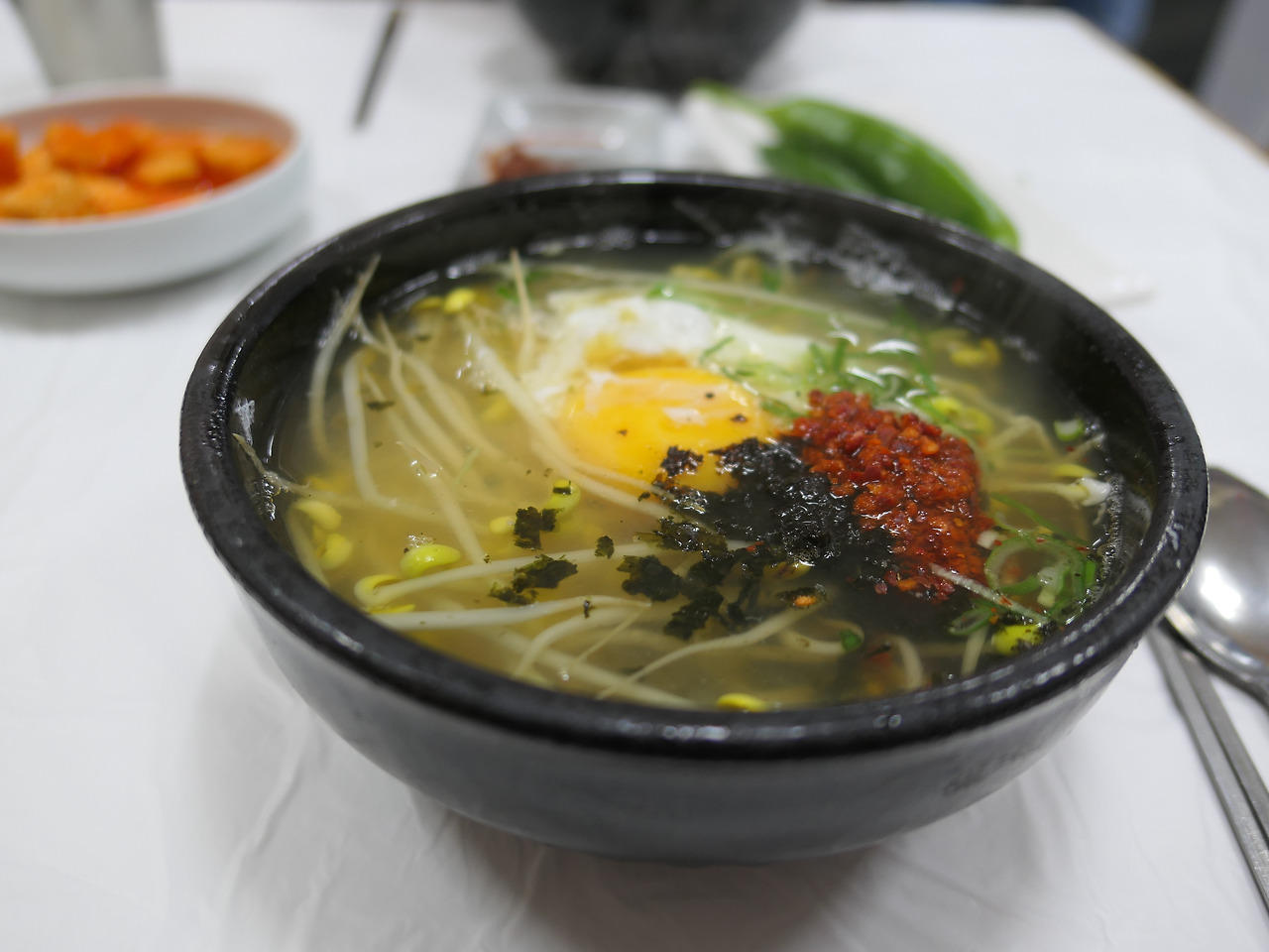 손님 입장에서 선택할 수 있는 것은 딱 하나 '계란 노른자를 풀지 말지 하는 것'뿐이다. 노른자를 남기면 깔끔한 국물을 맛볼 수 있고, 처음부터 터뜨리면 비주얼은 탁하지만 더 고소한 국물을 느낄 수 있다. 미리 노른자를 빼 달라고 요청할 수는 있으나, 가급적 천천히 터뜨리고, 그 전에 국물 원본(?)을 충분히 맛보길 권한다. 콩나물국밥의 핵심인 토렴은 사장 부부 내외가 번갈아 하시고, 스무 개 남짓한 테이블은 회전이 워낙 빨라 열댓 명의 종업원이 분주하게 움직인다. 국물 추가, 밥 추가, 콩나물 추가가 각각 가능해서 양이 부족할 일은 없다.