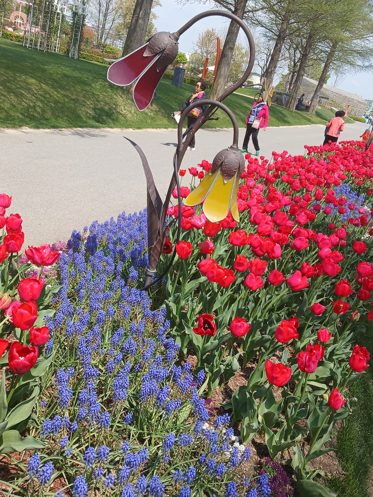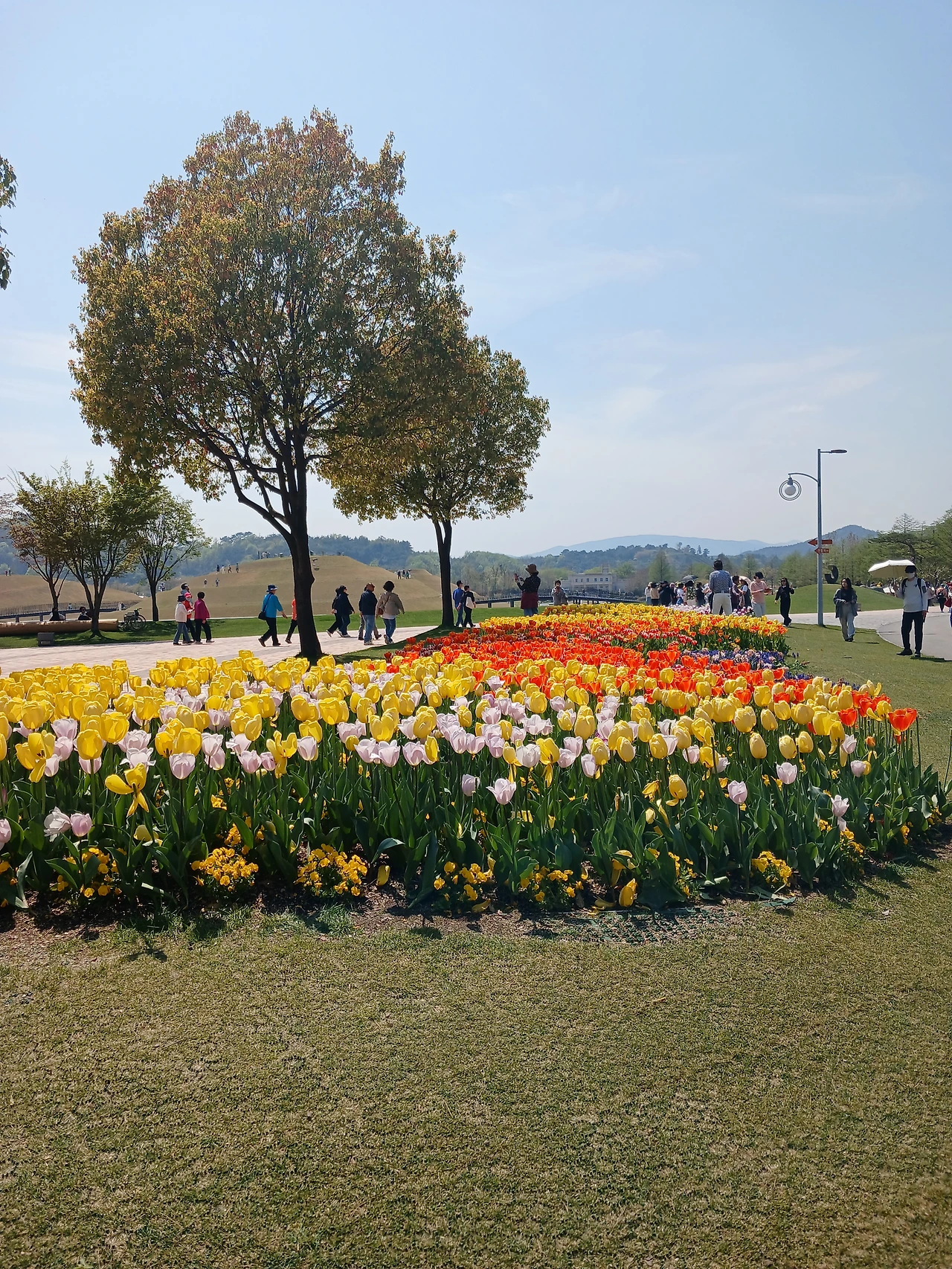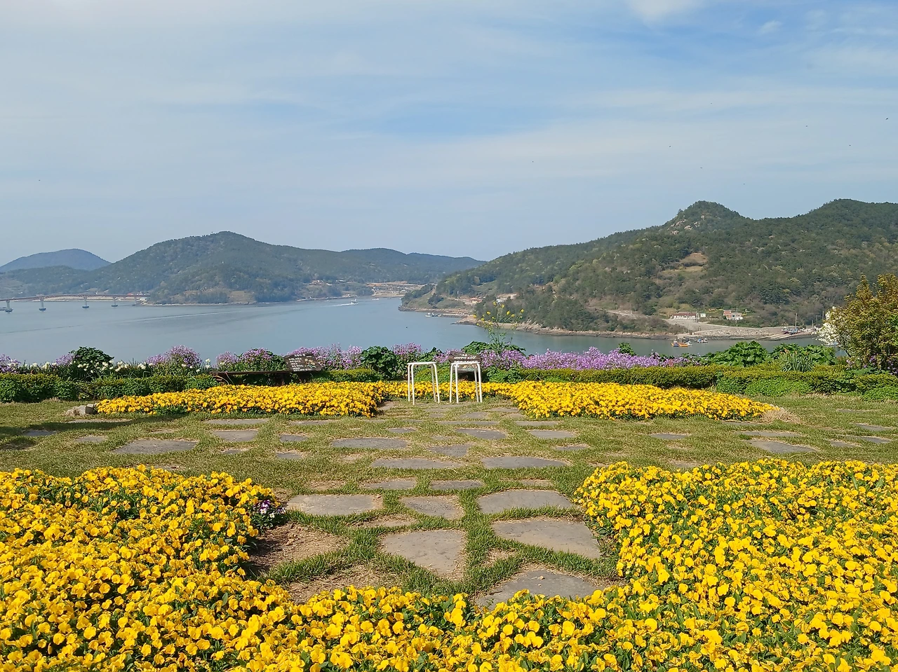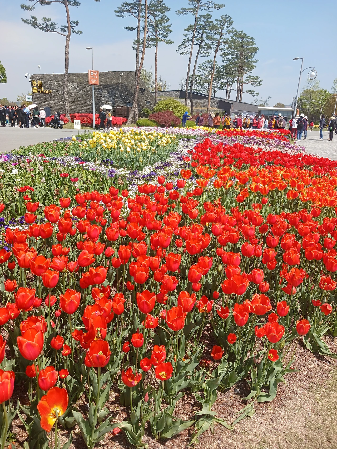 공기가 맑고 날씨가 화창한데 정원에는 꽃이 만개했다. 노랑, 빨강, 흰색이 섞인 튤립이 제일 많고 그밖에 꽃도 만개해 총 천연색으로 펼쳐져있었다. 눈 호강을 하며 이곳저곳을 둘러보았다. 바다를 끼고 온통 꽃밭에 꽃들이 만개하여 서로 아름다움을 뽐낸다. 1시간여 관람 후 버스로 이동하여 나로호 근처에 있는 쑥섬으로 이동하였다.