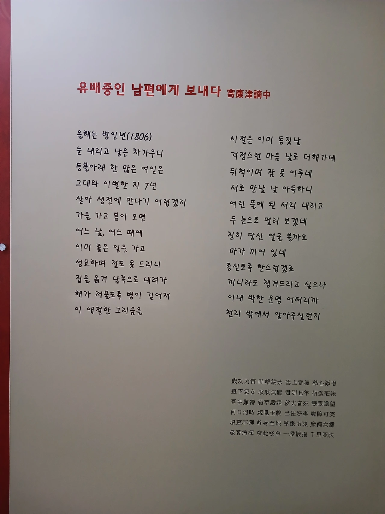 그중 유명한 목민심서를 비롯하여 흠흠신서, 경세유포등 500여 권의 방대한 저술 남겼다고 한다. 가장 마음에 와닿던 것은 부인이 남편에게 쓴 애절한 편지와 다산이 아들에게 보낸 편지가 찡하게 울려온다.