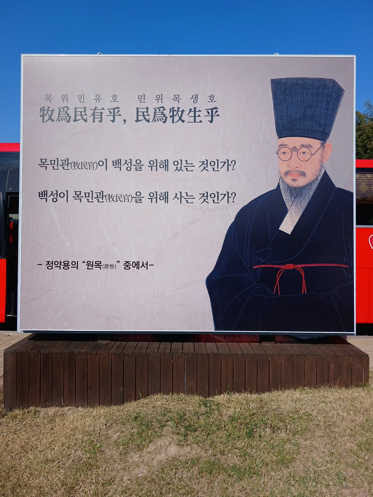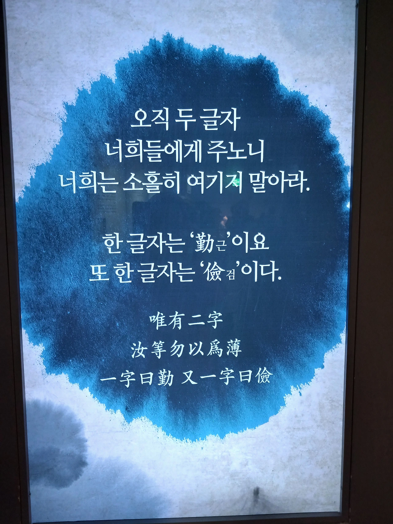 멀리 떨어져 있는 아들에게 오직 두 글자 근(勤)과 검(儉)을 명심하라는 절절한 말귀 부모 마음은 동서고금을 통해 같은 마음이라... 열심히 배우고 절약하며 살아가라는 내 좌우명과 일맥 상통했다. 또한 부인이 멀리 떨어져 있는 남편에 대한 그리움을 담은 편지도 있었다. 내부를 살피고 밖으로 나오니 포토죤이 있어 단체사진을 찍고 주위를 둘러보니 다산 선생의 글귀가 비석처럼 새겨져 있다. 하나같이 좋은 글귀들이다. 참으로 훌륭한 분이라는 걸 새삼 느꼈다. 조선시대 이런 분들의 말씀을 잘 따라서 정치를 했다면 조선 왕조가 패망하지는 않았을 텐데... 아쉽다. 조선의 역사를 생각해 볼 귀중한 시간이 되었다.