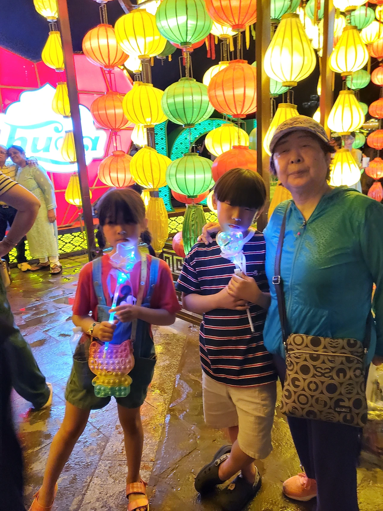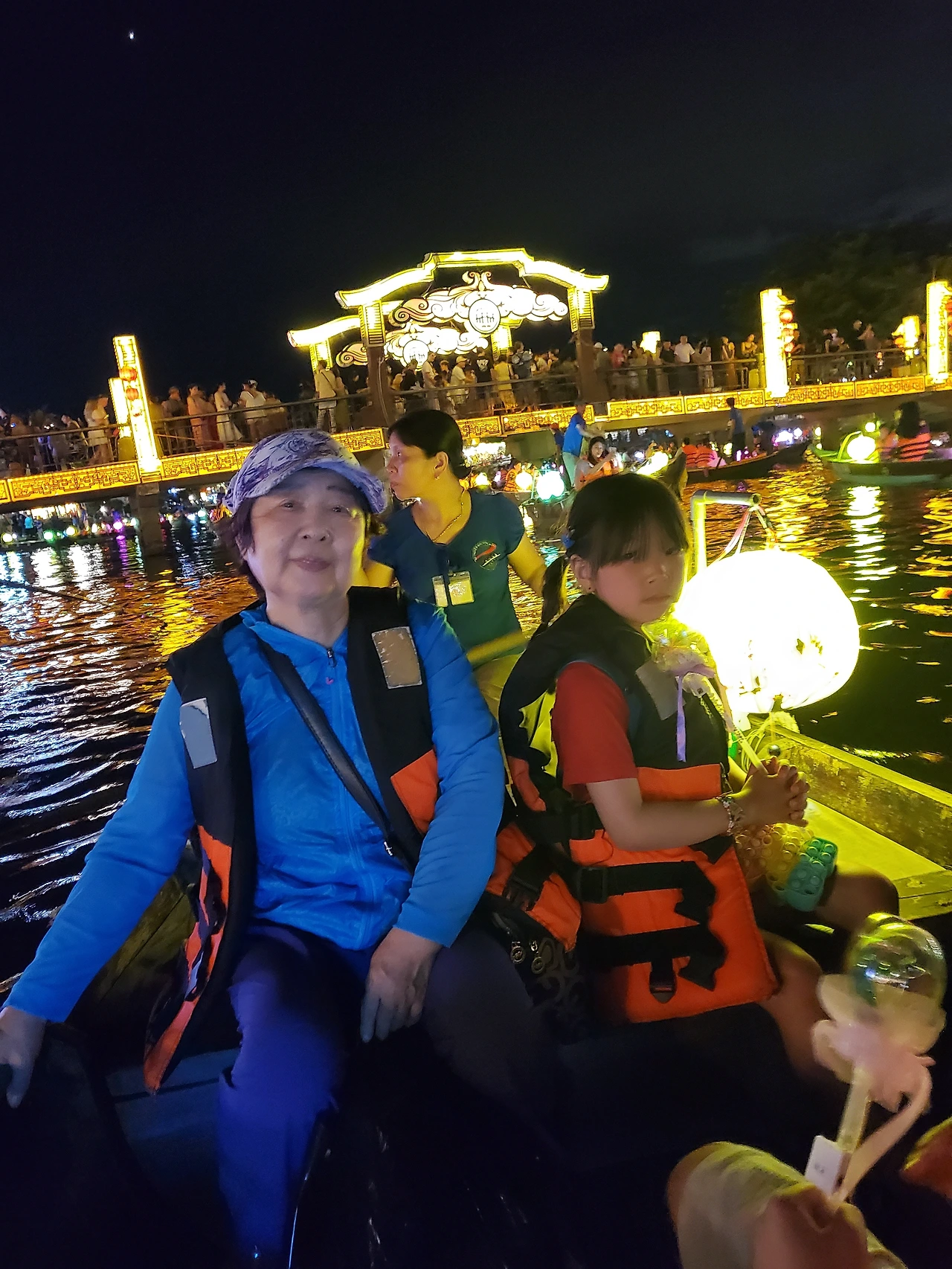 저녁 식사 후 다음 투어까지 2시간가량 자유 시간을 주어 티본강 주위를 다니다가 한화 5000원짜리 발 마사지를 4명이 받아보았다. 시간은 40분 정도인데 가격대비 훌륭했다. 손녀(8살)가 시원하고 좋다며 더 받고 싶어 했다. 5000원짜리 발 마사지라 우습게 봤는데 나름 괜찮았다. 여행의 피로가 조금은 풀린 것 같았고 기분이 상쾌해졌다. 베트남의 물가는 우리의 10/1 수준인 거 같으니 그곳 돈으로는 5만 원 정도 했다. 마사지를 받고 거니니 상인들이 무척 많이 다니며 가방, 지갑, 장난감등을 팔길래 재미로 몇 가지 샀다. 지인에게 가벼운 선물로는 괜찮을 것 같아서... 투본강 주변이 관광객과 상인들로 붐벼 오고 가기가 불편할 정도였고 관광객의 90% 이상이 한국인인 거 같았다. 그래서 이곳은 한국 돈도 받는다. 그만큼 한국 관광객이 압도적으로 많았다. 여기가 베트남인지, 한국인지 의심스러웠다.