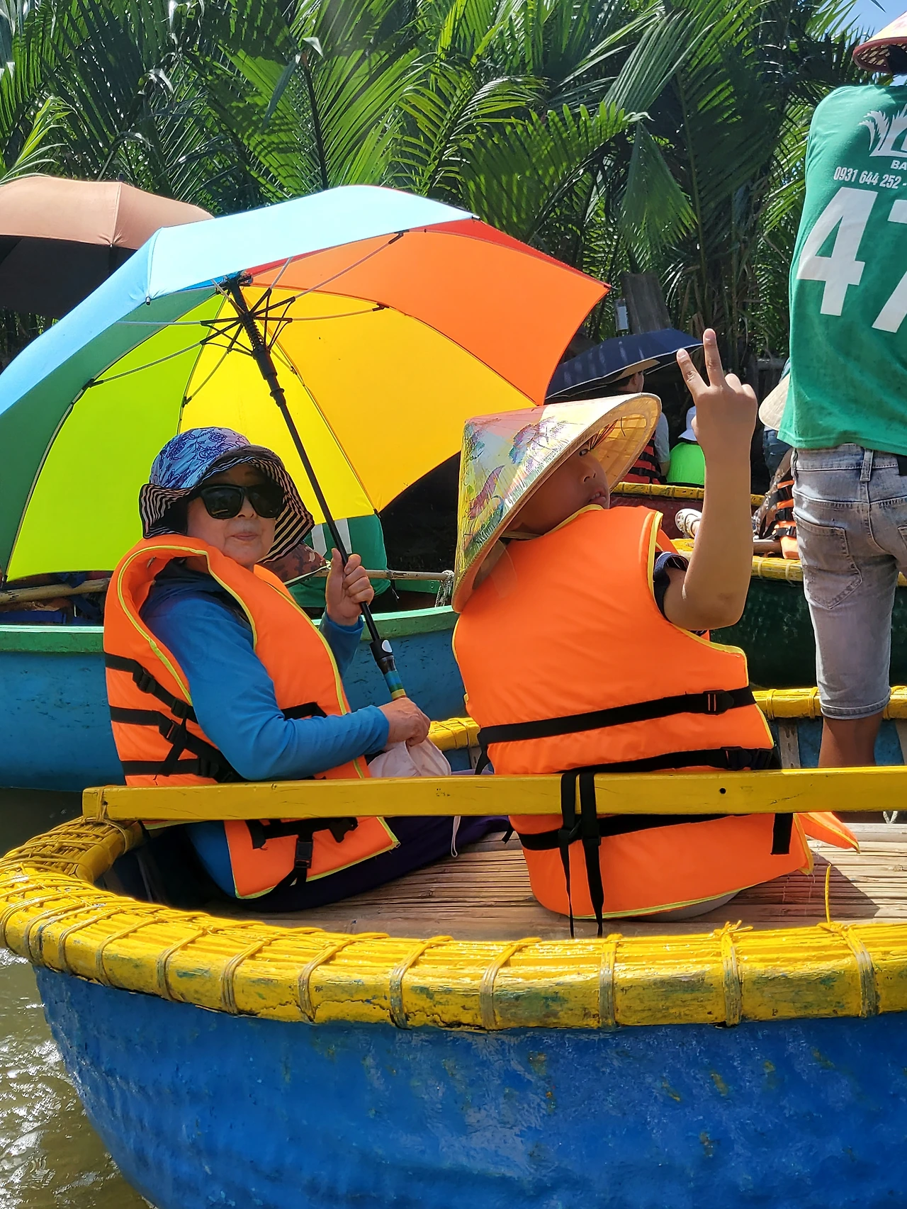 다음은 호이안으로 옮겨 투본강으로 갔다. 투본강의 명물 대바구니배를 2명씩 타고 사공이 저어 강을 관람하며 쇼장으로 갔다. 강 중간쯤 무대를 만들어 노래하며 춤을 추는 곳이 나왔다. 관광객 90% 이상이 한국 사람이라서인지 가수들이 한국 트로트를 부르고 몇몇이 나와 노래에 맞춰 춤을 췄고, 우리 손주들도 무대로 나가 어디서 흥이 났는지 신나게 흔들었다. 동영상으로 애들 엄마가 촬영을 했고, 한 두곡 춘 후 내려왔다. 흥겨운 시간이었다. 여기저기에서 팁을 준다. 나도 줬다. 수고비는 줘야지 저들은 그것으로 생계를 유지하는데 - - 한참 더 탄 후 배에서 내렸고 사공에게도 약간의 팁을 줬다. 배에서 내리니 가이드가 망고 한 접시씩 먹고 가라고 하였다. 물론 이 것도 옵션비에 다 포함되어 있겠지.. 3-40분 바구니 투어 비용이 일인당 30달러다.