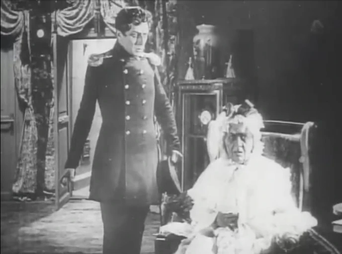그렇다면 인물과 각본은 어떨까요. 당시에는 낭만적인 주인공을 등장시킨 환상적인 작품이 유행했습니다. 마치 조선에서 박씨전과 홍길동전이 유행했던 것처럼, 대중의 욕망을 실현시킬 수 있는 작품이 인기를 끌었죠. <스페이드 여왕>은 그러한 작품들이 현대의 기조라고도 볼 수 있는 현실을 그대로 반영한 작품으로 넘어가는 시초격인 작품입니다. 예를 들어 볼까요. 게르만은 환상문학에 자주 등장했던 영웅적인 주인공이 아닙니다. 이름부터 게르만, 독일인인데요. 독일인은 재미없고 지루하다는 편견이 있고 게르만은 그 편견에 부합하는 인물로 의도적으로 그려집니다. 또 여주인공 리사는 왕자를 만난 공주가 아닙니다. 냉정한 야심가 게르만에게 버림받는 역할을 맡고 있으니까요. 특히 담당 배우인 이반 모주힌은 게르만을 연기할 때 나폴레옹 특유의 팔짱 낀 자세를 따라해 고압적인 태도와 오만함, 고뇌를 동시에 드러내었습니다. 지금은 아닐지도 모르겠지만 당시에는 이러한 클리셰를 벗어나는 포인트들이 <스페이드 여왕>을 빛내주기도 하였습니다.