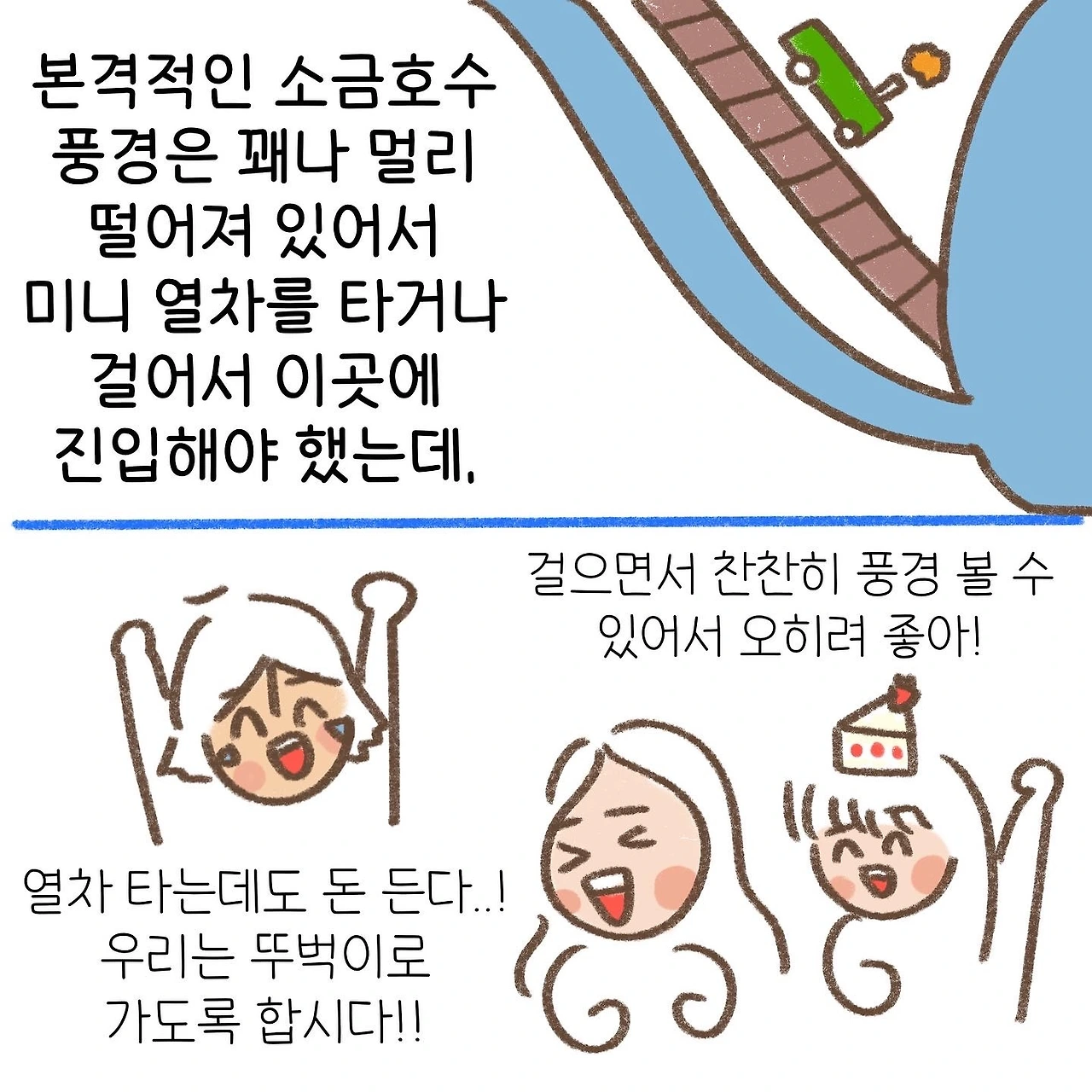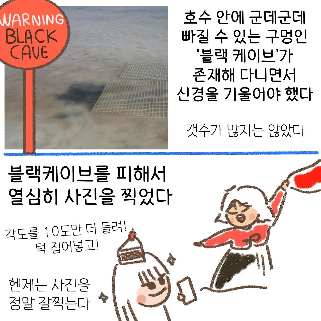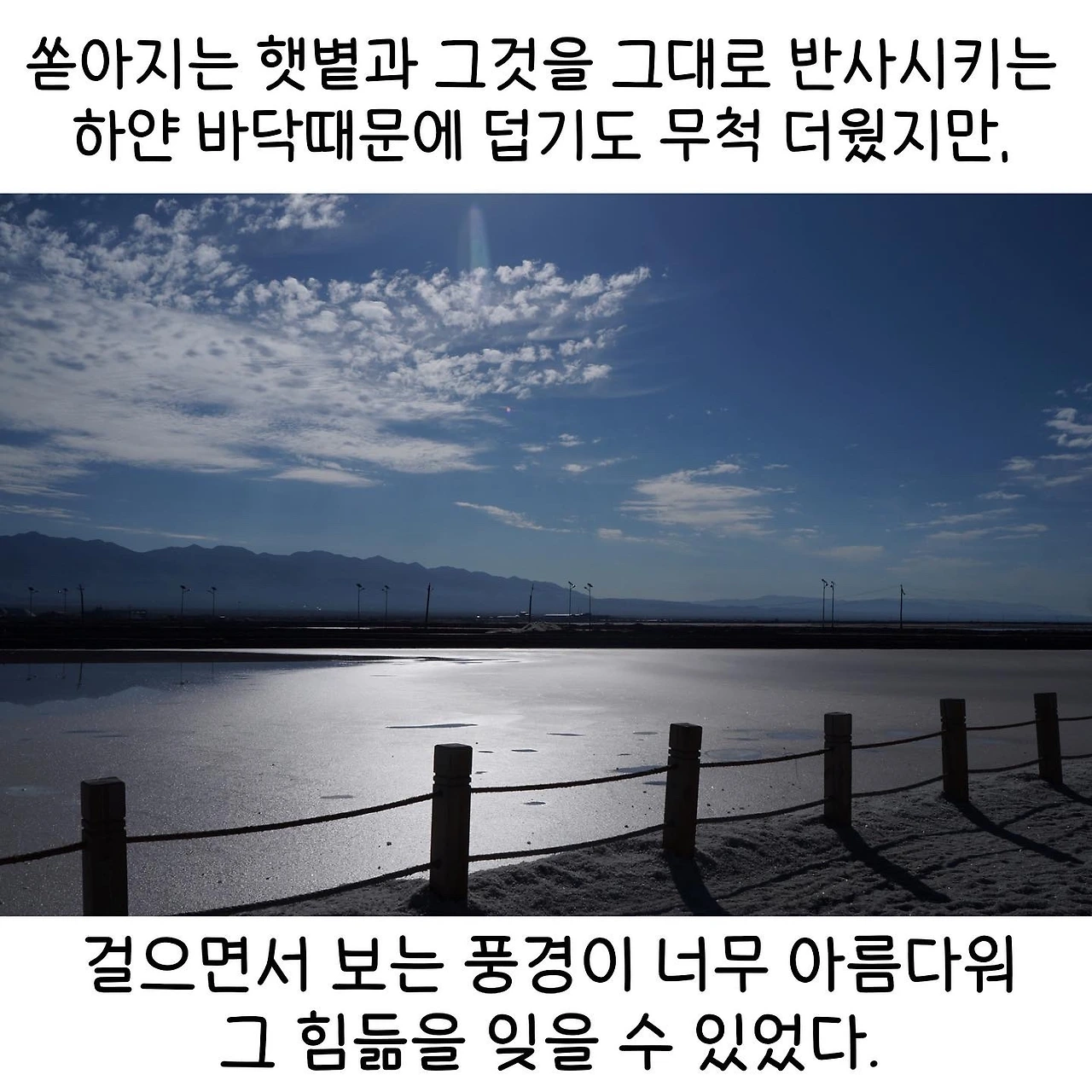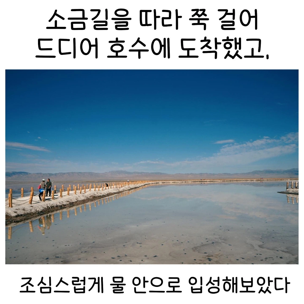 남미에 가야만 만날 수 있는 줄 알았던 소금호수를 이렇게 마주하게 되니 느낌이 얼마나 새로웠는지 모른다. 소금호수에 한번 들어갔다 나오니 물에 젖은 옷이 소금에 절어 빳빳하게 굳어버리고 말았다. 한복 치마가 상하기라도 하면 어떡하나 걱정했는데, 빨래를 하니 다시 돌아와 다행이었다.